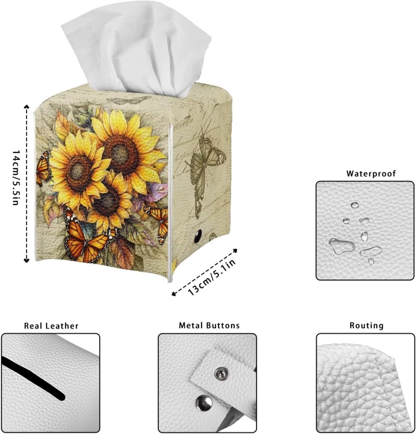 Sunflower Tissue Box Cover Square Leather Tissue Cover 5x5x5 inch Oil Paited Style Home Decorative Facial Paper Box Holder for Desk Bathroom Vanity Countertop