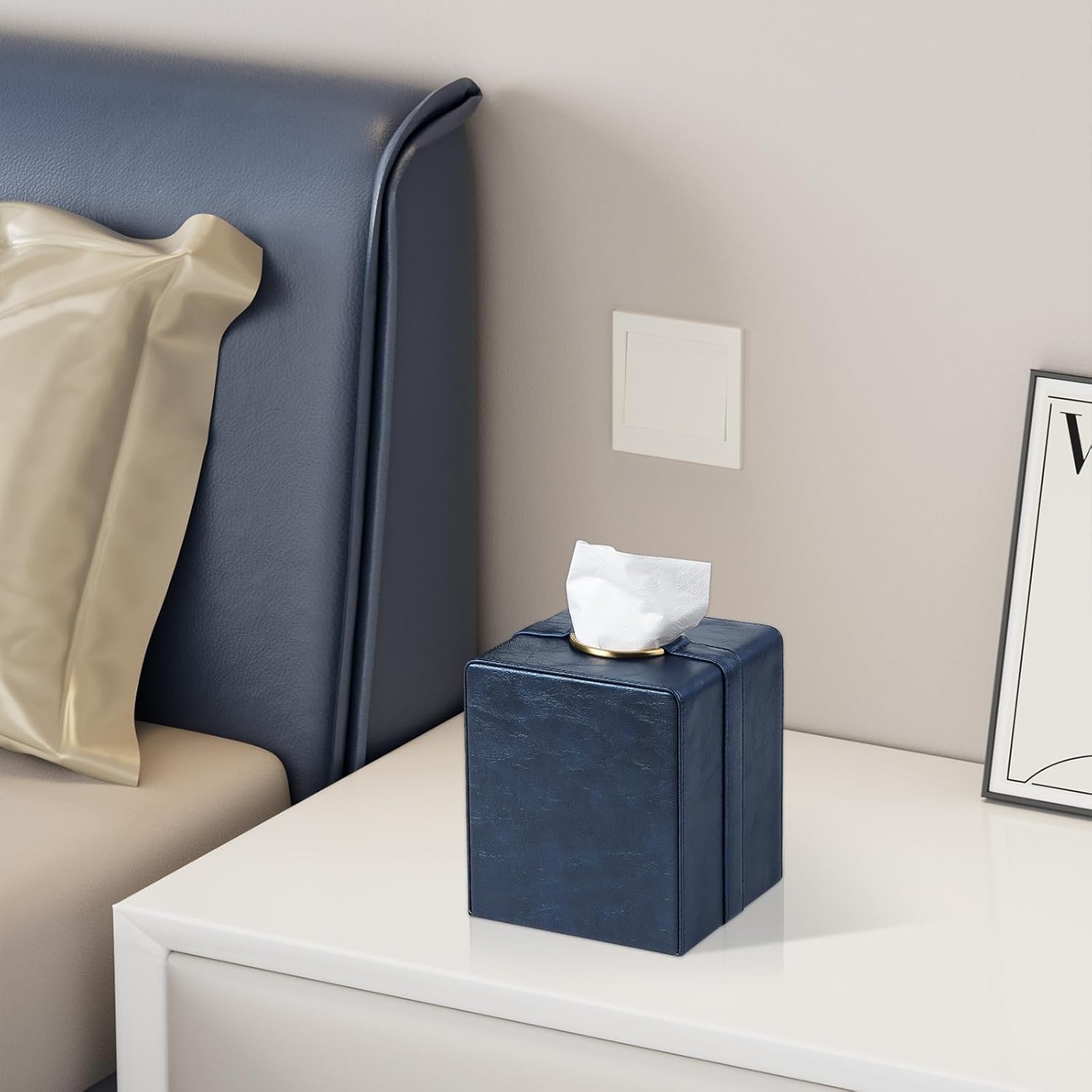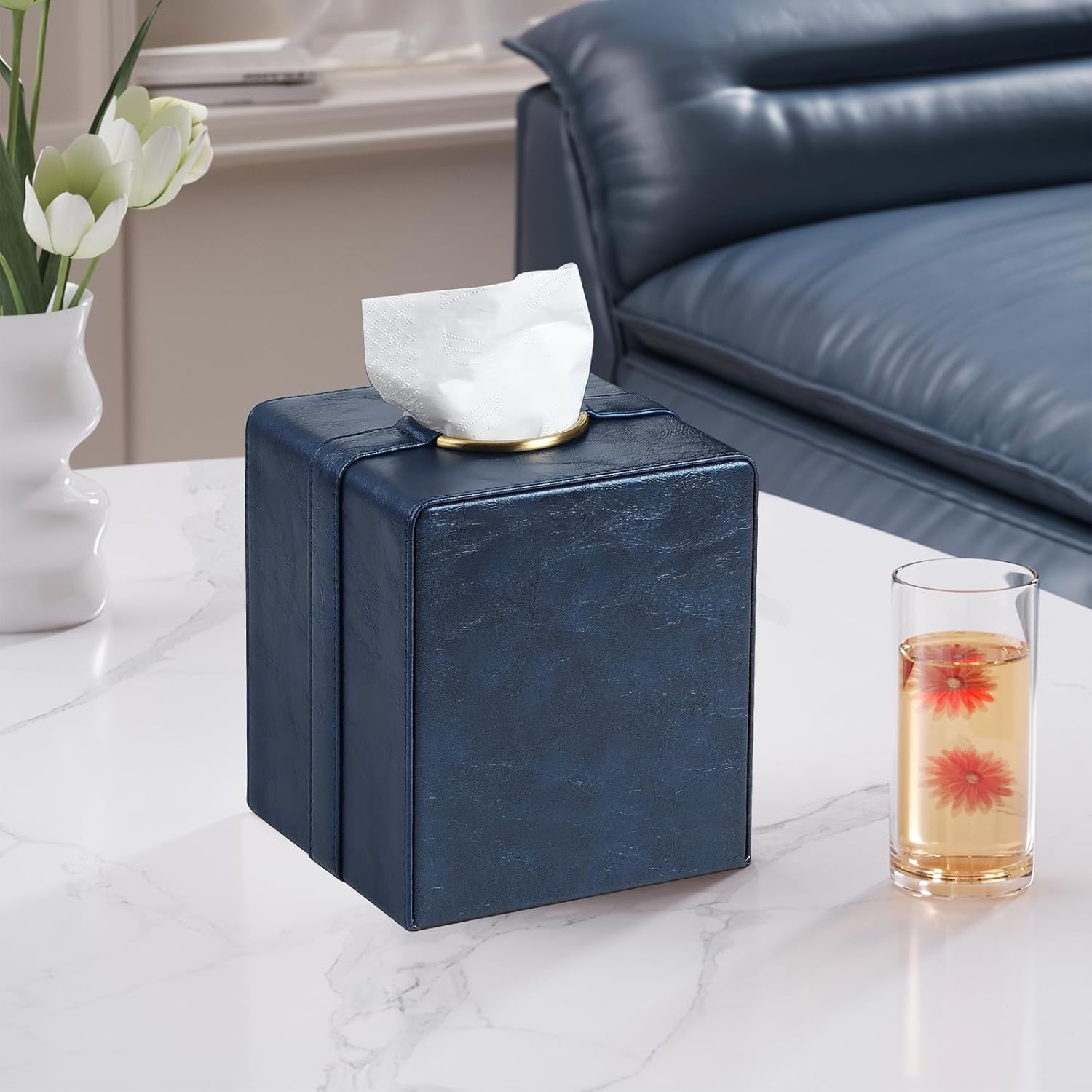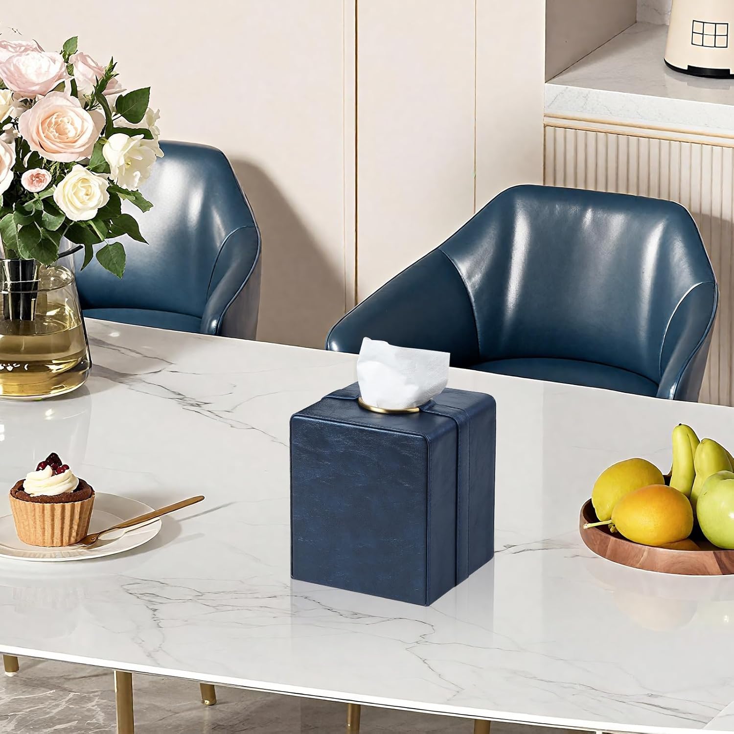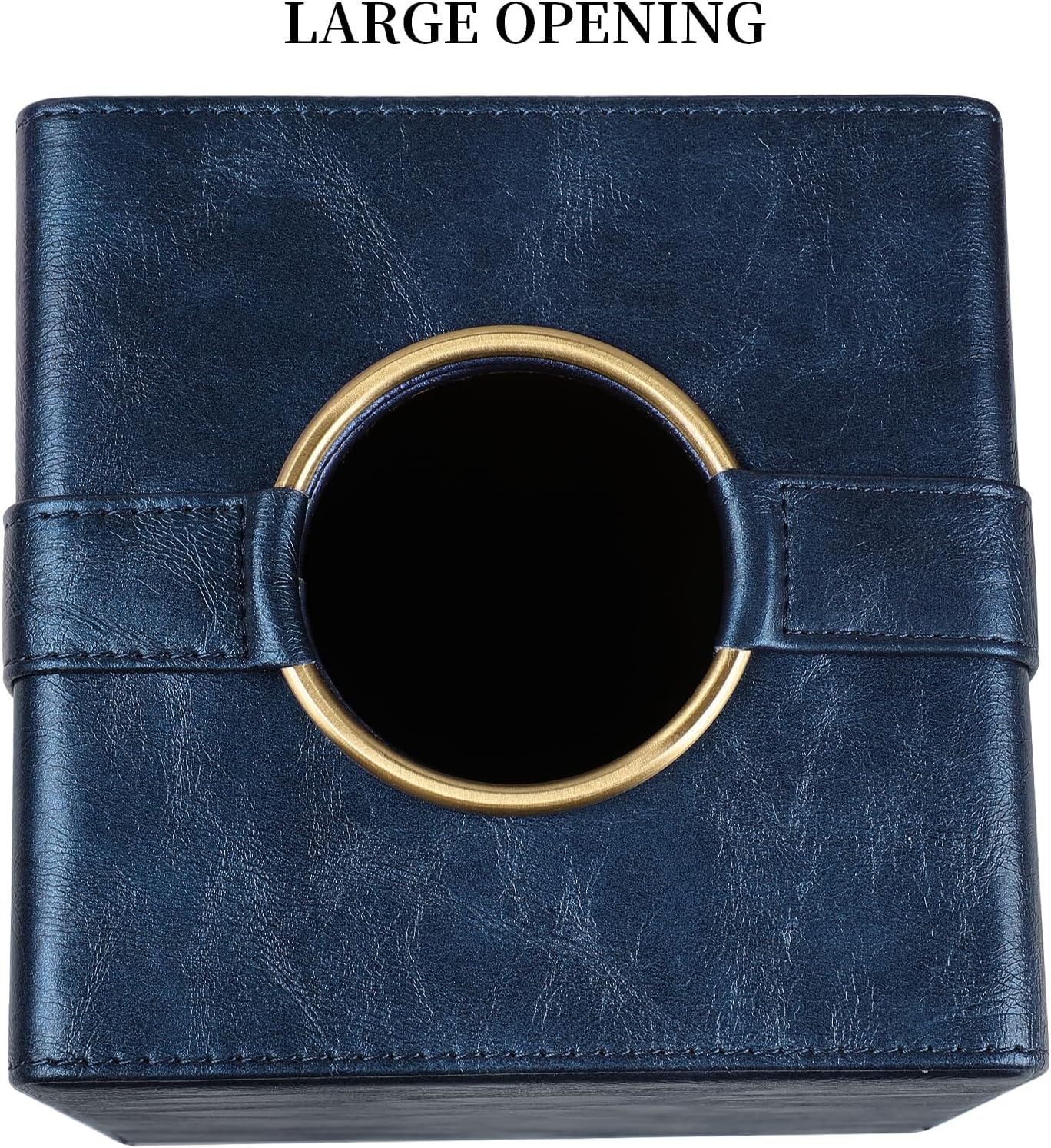 Luxury Square Tissue Box Cover, PU Leather Tissue Box Holder with Magnetic Closure and Gold Decorative Grommets for Bathroom Bedroom, Decorative Elegant Cube Tissue Holder (Blue)