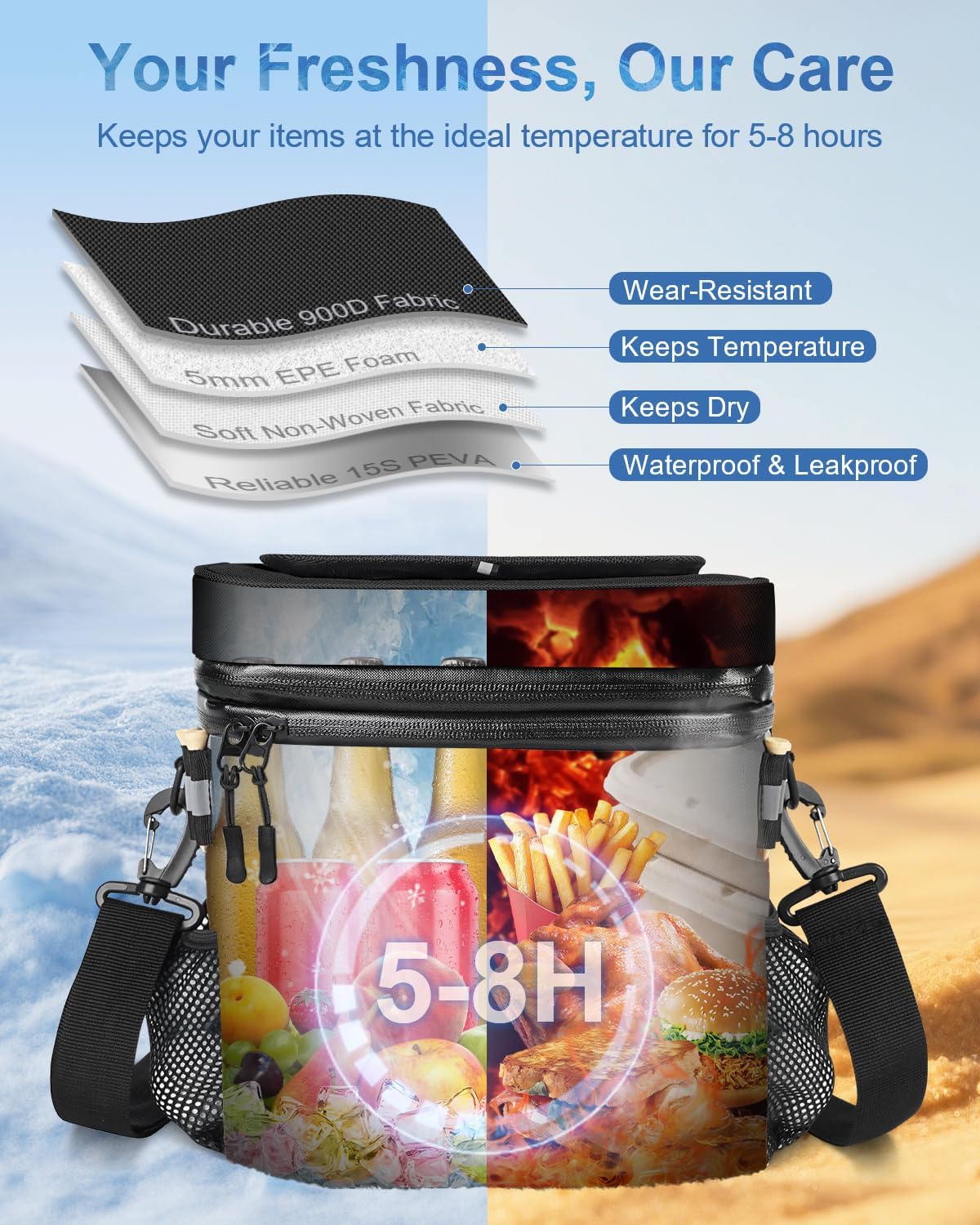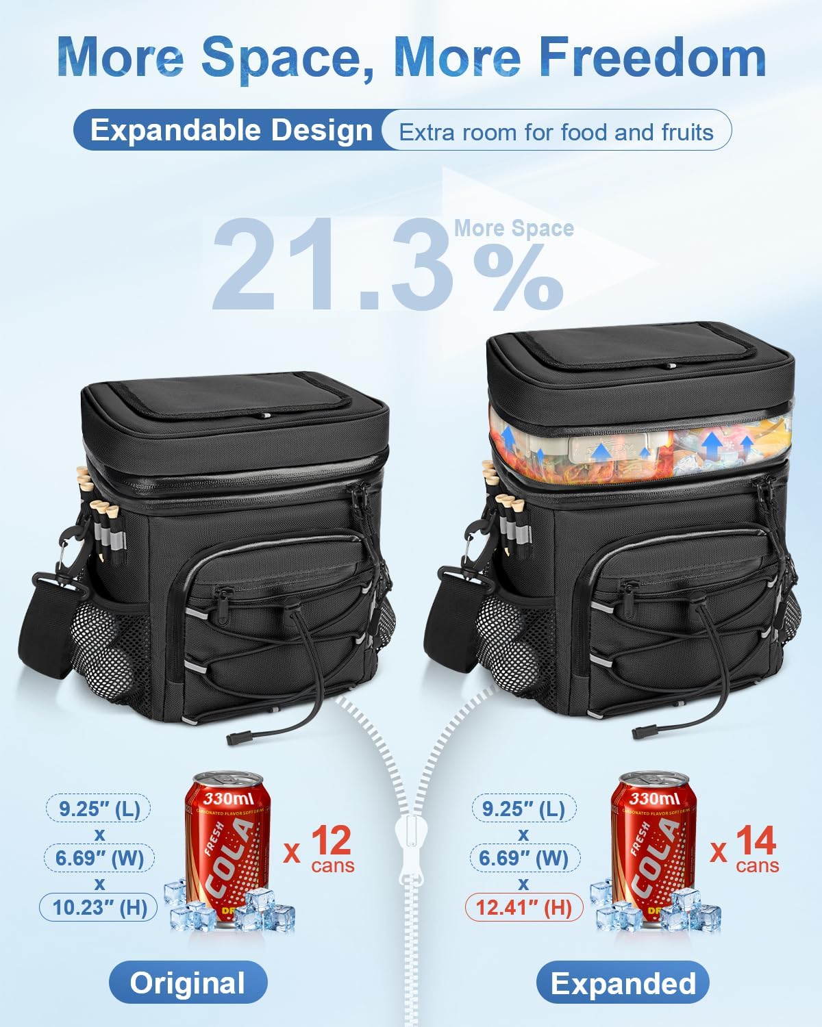 - Expand As You Go: Never cut adventures short! Your cooler bag instantly unlocks 21.3% extra space for drinks, snacks, or fruits. Ideal for surprise beach hangs, bonus holes, or spontaneous picnics – room for more memories