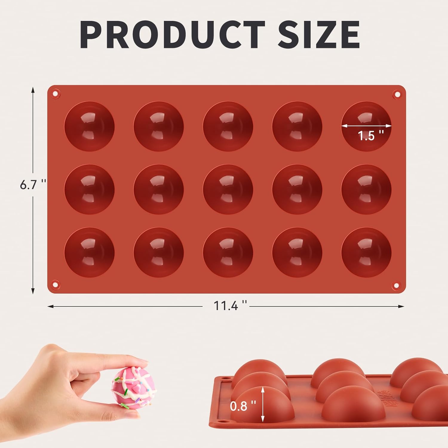 - Small Size: Medium Size: The 15 cavity semi sphere silicone mold is 11.4"L x 6.7"W x 0.8"H and each cavity is 1.5"D x 0.8"H. You can made a perfectly chocolate ball if stick 2pcs semi sphere molds together