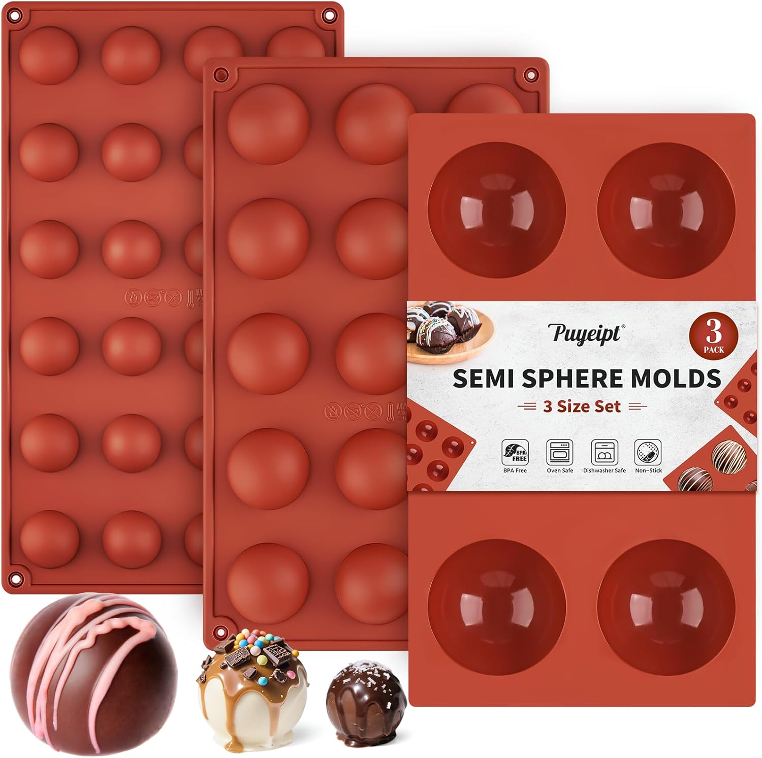 - 3 Sizes: Each semi sphere silicone mold set make 3 sizes hot cocoa bombs, including diameter 2.6 inch/ 1.5 inch/ 1.1 inch. You can made a perfectly chocolate ball if stick 2pcs semi sphere molds together