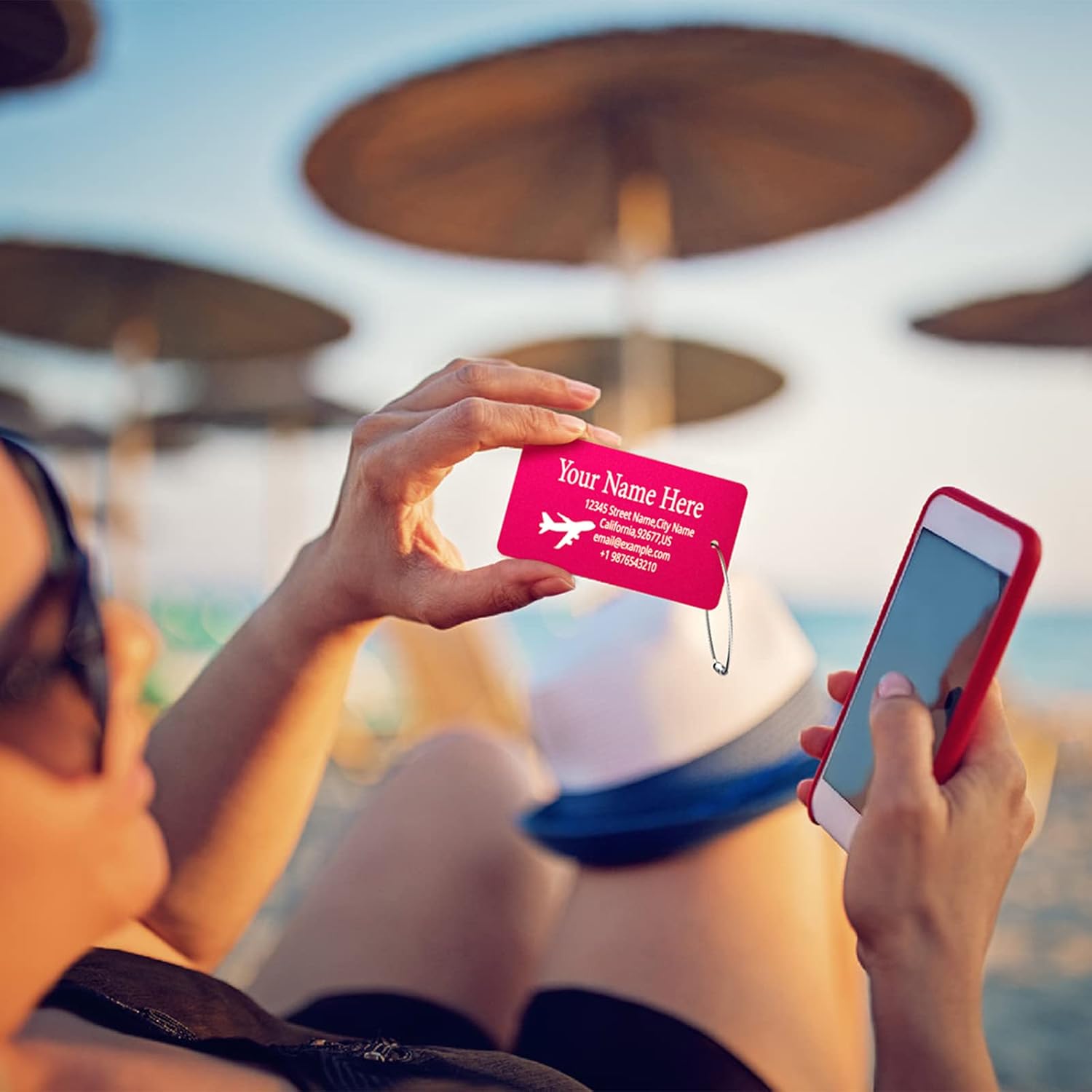 - CUSTOMIZABLE INFORMATION: Luggage name tags offer complete customization, allowing you to add your name as well as other key information such as your address, phone number, destination, travel dates, and more (up to five lines of text). This ensures your luggage is easy to spot and helps keep it safe from loss or theft.