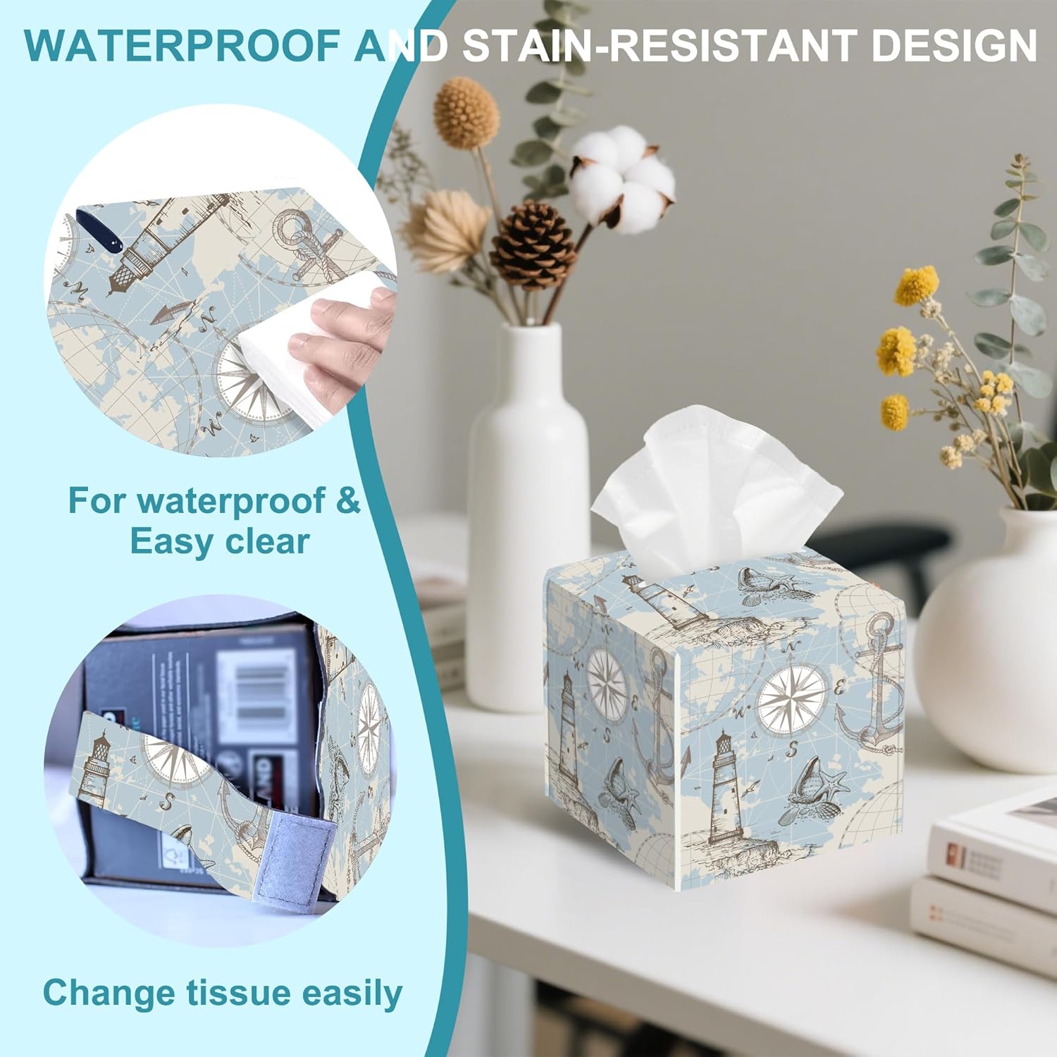 Compass Sea Map Tissue Box Cover,Anchor and Seashells Tissue Box Holder Square,Waterproof Leather Organizer Portable Decorative Facial Paper for Bedroom Dresser Night Stand Office,5.2" x 5.2" x 5.2"