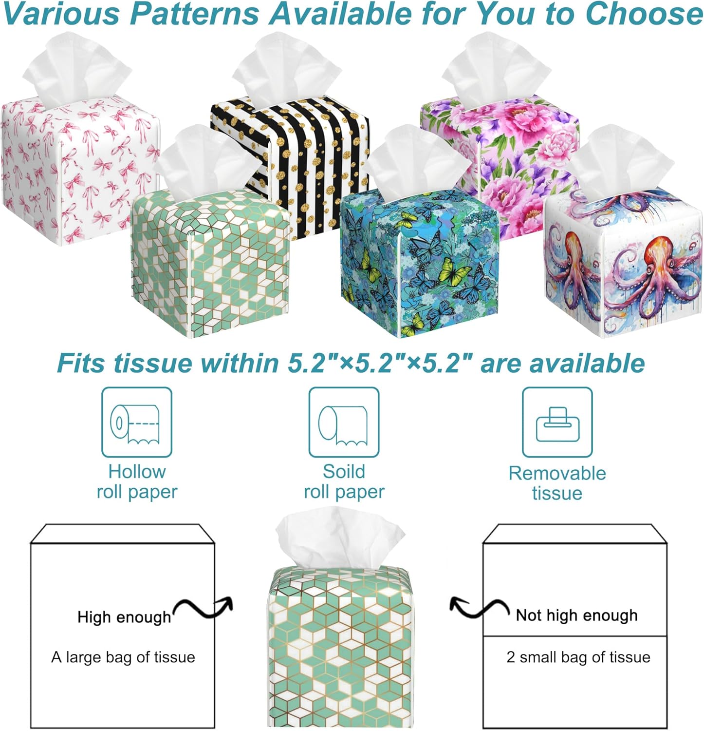 - Square Tissue Box Cover: Tissue box cover measures 5.2"L x 5.2"W x 5.2"H,reasonable size can accommodate most standard square tissue boxes. It is designed to be compact, which can not only save space and keep the desktop tidy but also provide clean tissues at any time