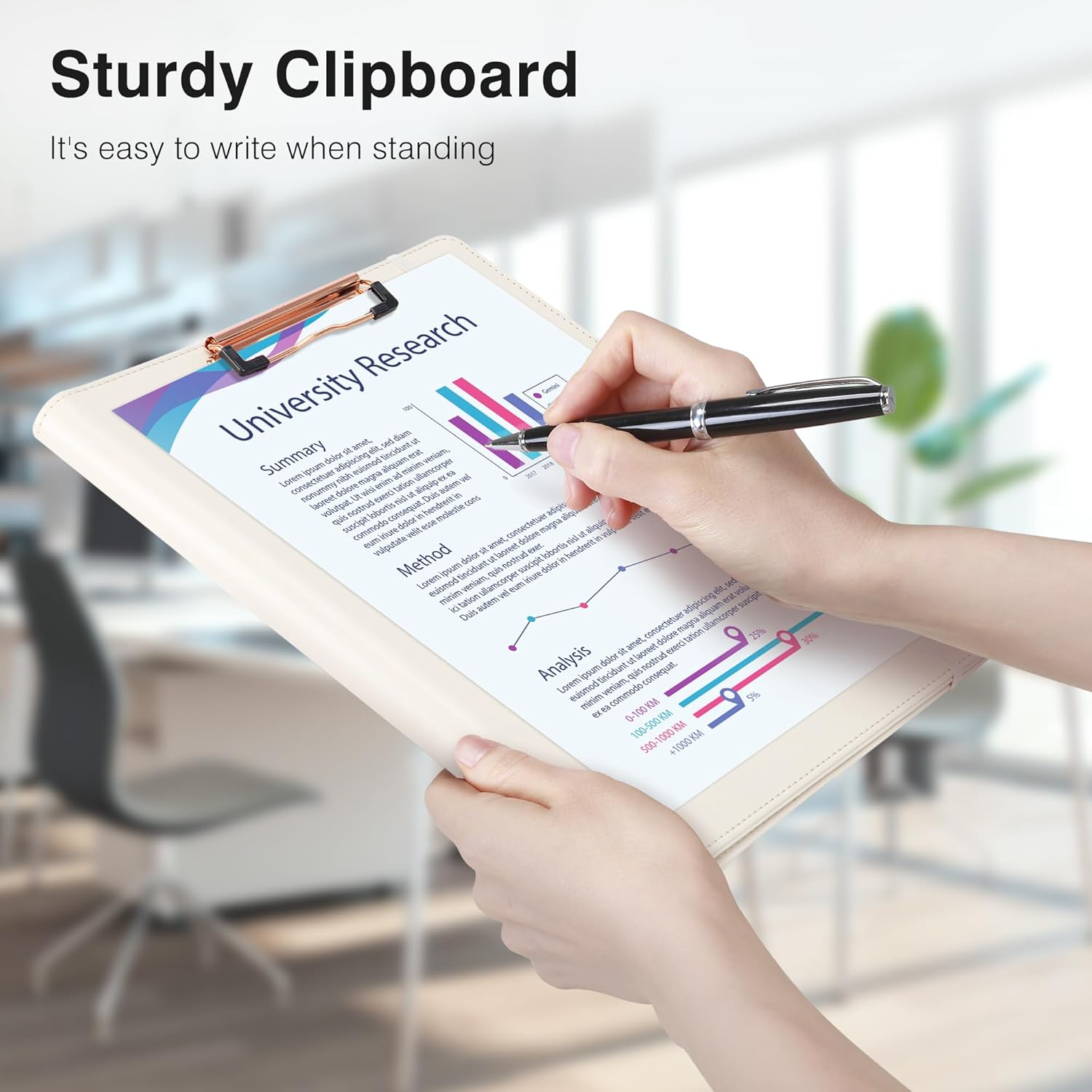 - 【Premium Material】 It is made of high-quality PU leather with reinforced stitching, making it far more durable than cardboard alternatives. The leather cover is easy to clean, and the rose gold metal clip securely holds 80–100 sheets even when writing while standing.