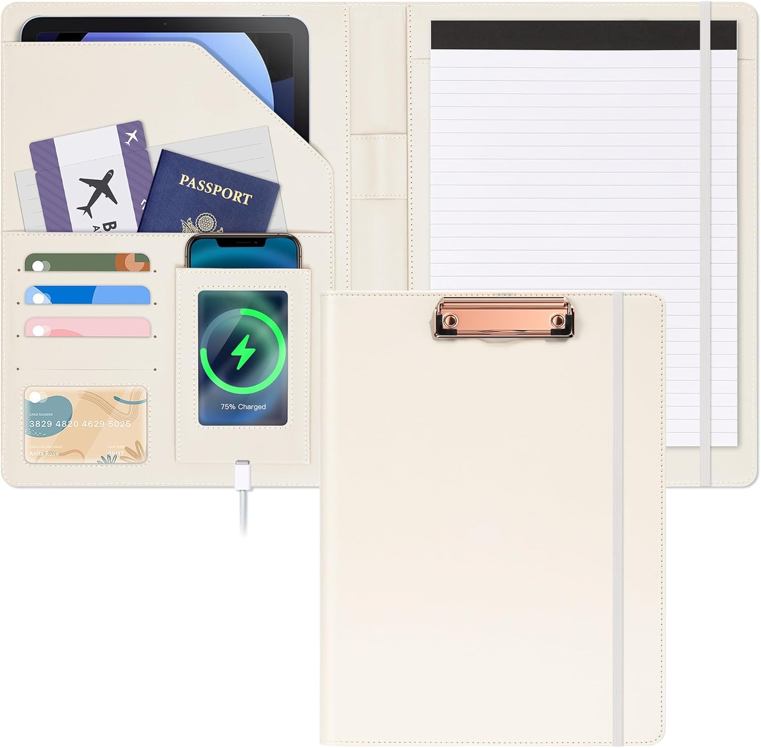 Ospelelf Foldable Clipboard Padfolio with Notepad 8.5 x 11, Faux Leather Business Clipboard Folio for Women Portfolio Organizer, Beige