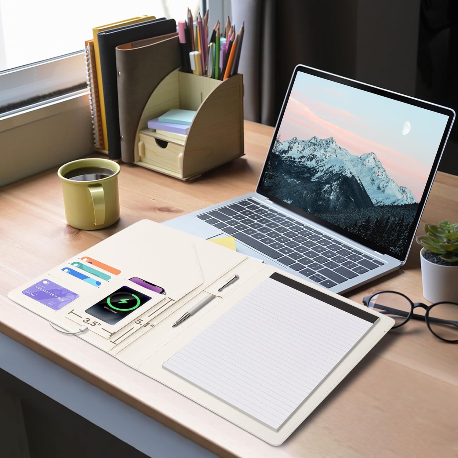 - 【Organized Storage】 This 360° foldable portfolio features a retractable transparent phone pocket (with a charging port) that accommodates phones up to 6.7 inches, plus 4 card slots adjacent to it. The right side includes a large pocket and holds the included notepad.