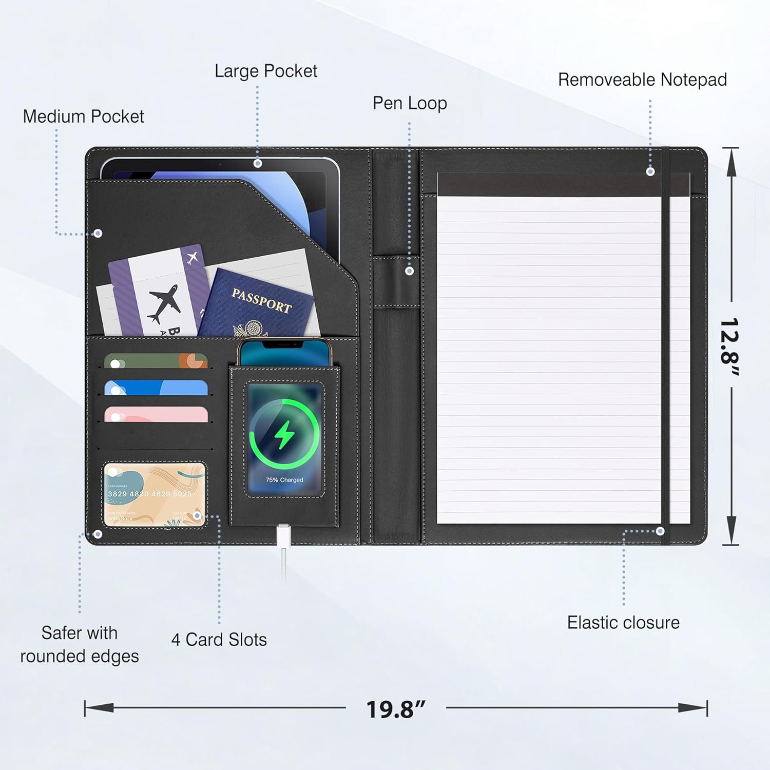 - 【Organized Storage】 This 360° foldable portfolio features a retractable transparent phone pocket (with a charging port) that accommodates phones up to 6.7 inches, plus 4 card slots adjacent to it. The right side includes a large pocket and holds the included notepad.