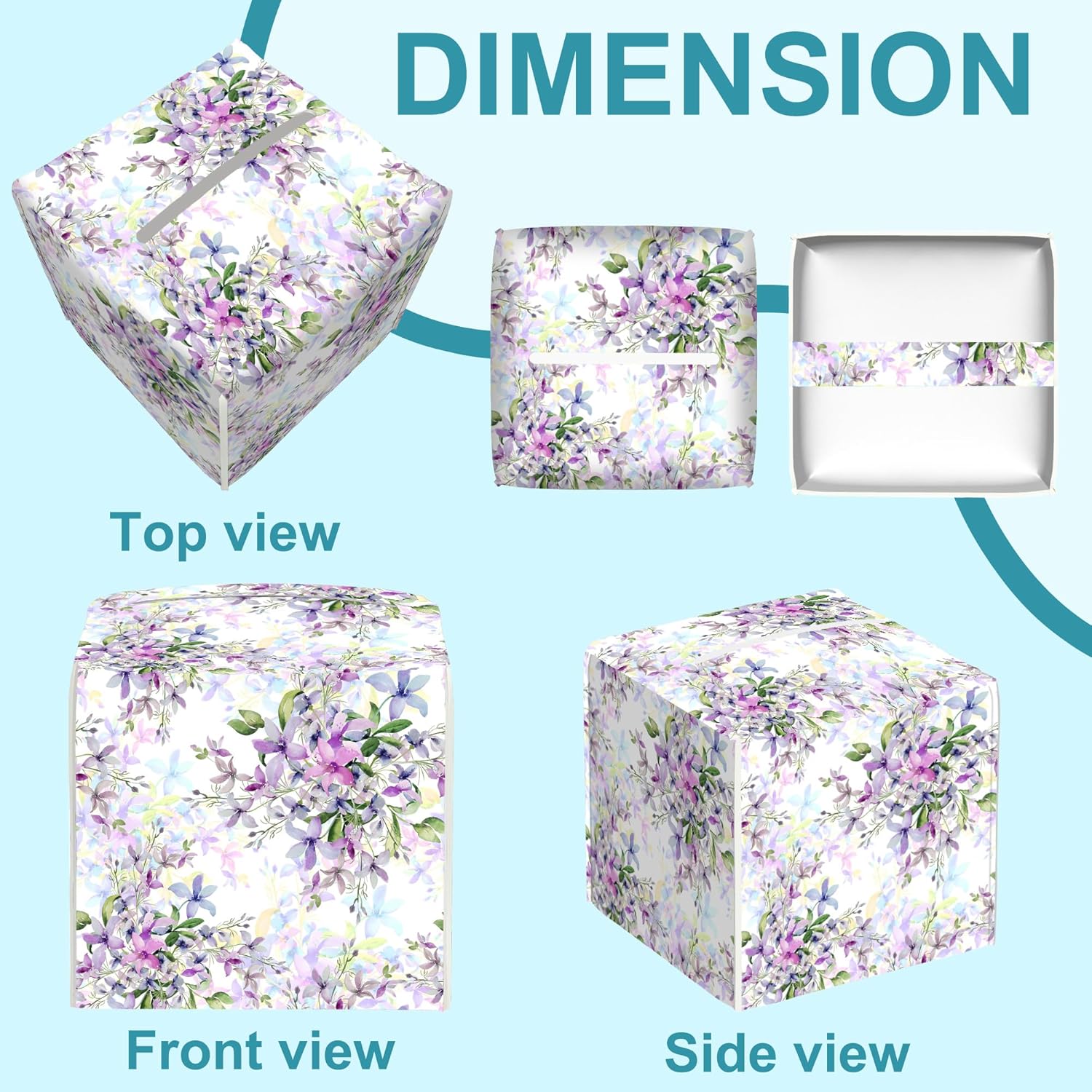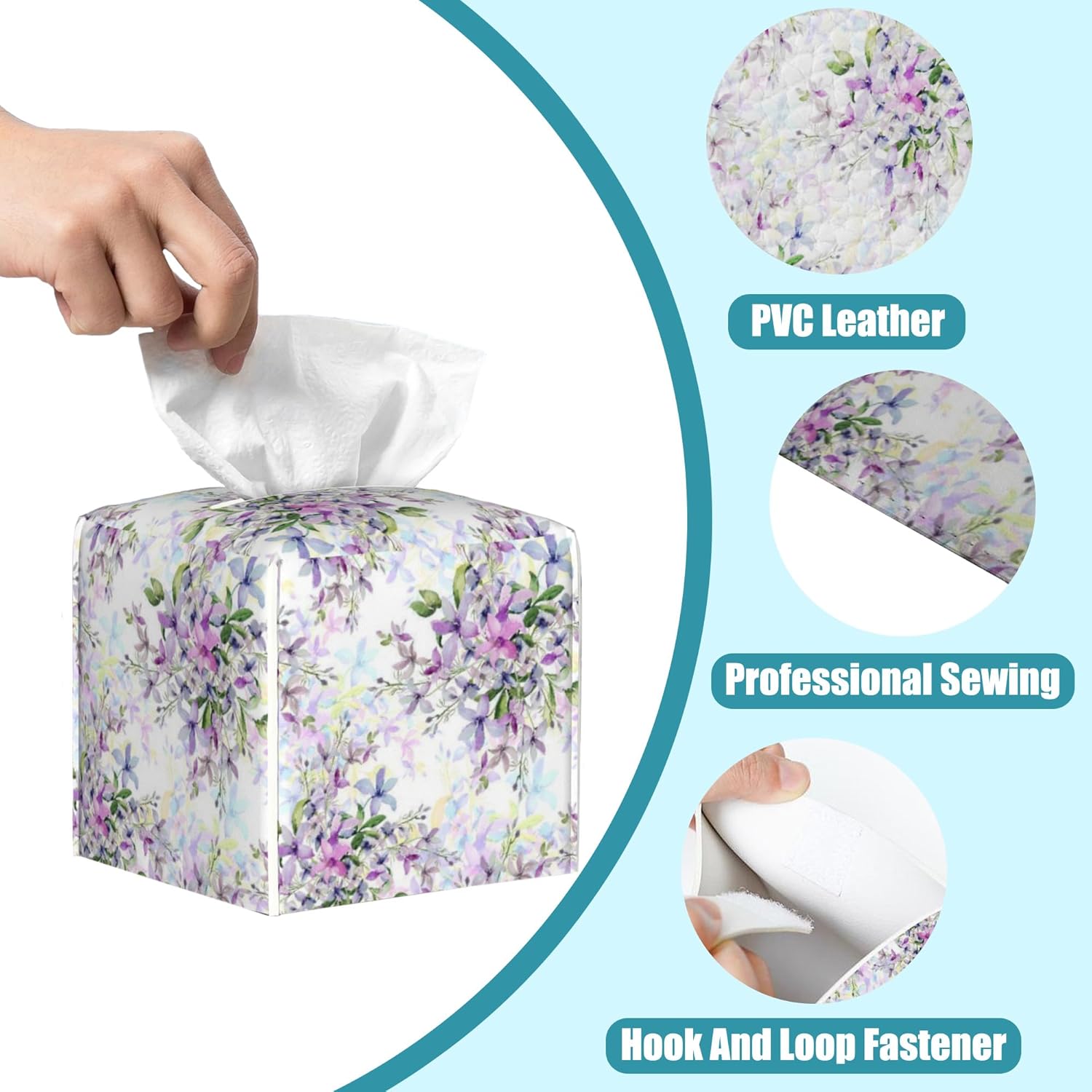 Watercolor Wild Flowers Tissue Box Holder,Purple Flowers Square Leather Tissue Box Cover with Bottom Belt,Modern Napkin Holder Organizer for Car Bathroom Nightstand Vanity Office,5.2" x 5.2" x 5.2"