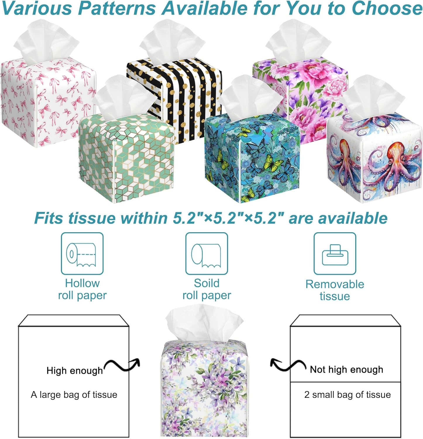- Square Tissue Box Cover: Tissue box cover measures 5.2"L x 5.2"W x 5.2"H,reasonable size can accommodate most standard square tissue boxes. It is designed to be compact, which can not only save space and keep the desktop tidy but also provide clean tissues at any time