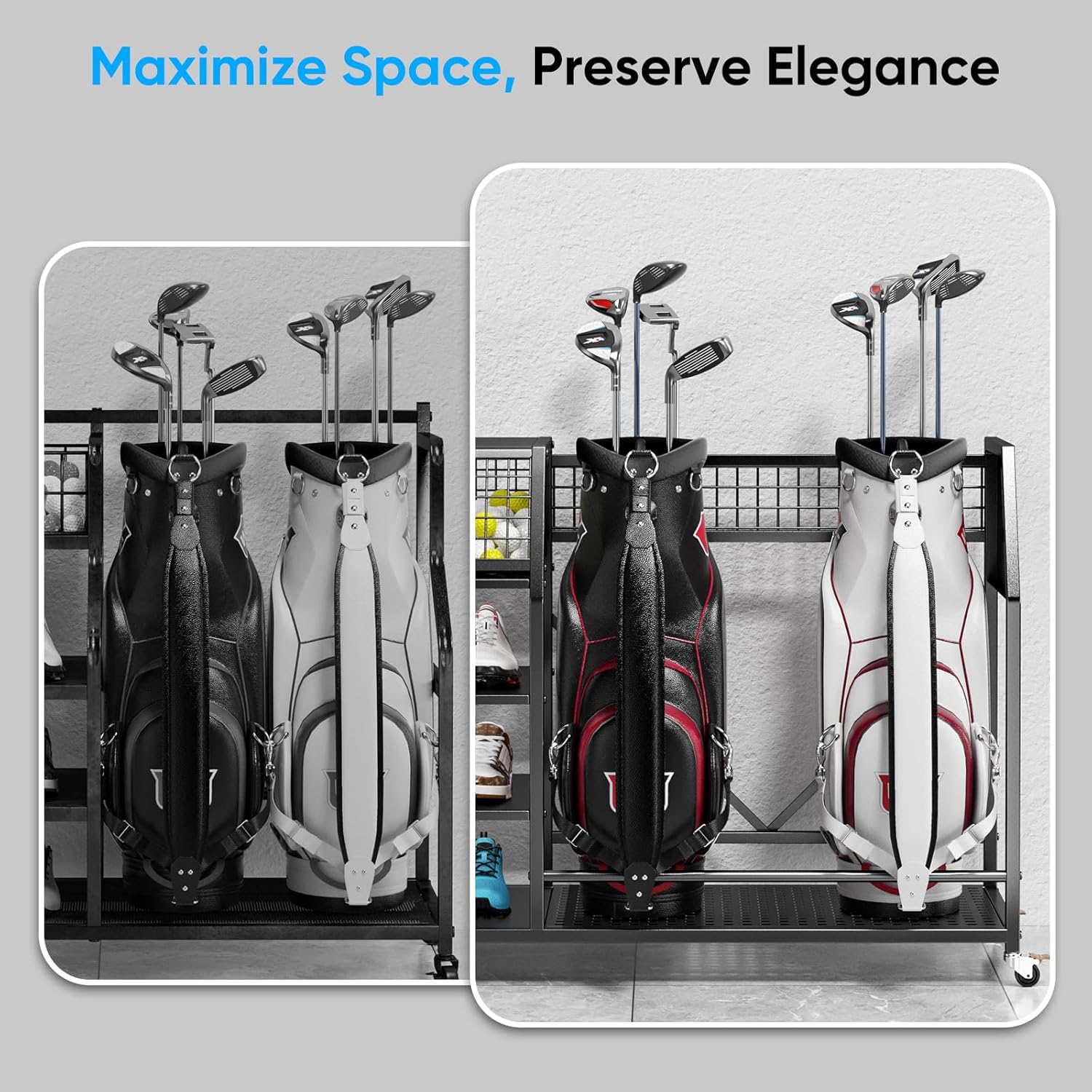 - UPGRADED LARGE CAPACITY: This multifunctional golf bag organizer can easily accommodate 2 golf bags, 27 golf clubs, up to 250 golf balls and 3 pairs of shoes or other accessories. The spacious design maximizes and saves storage space, especially suitable for families or golf clubs with limited space to store multiple golf bags, which is both practical and improves the tidiness of the space.