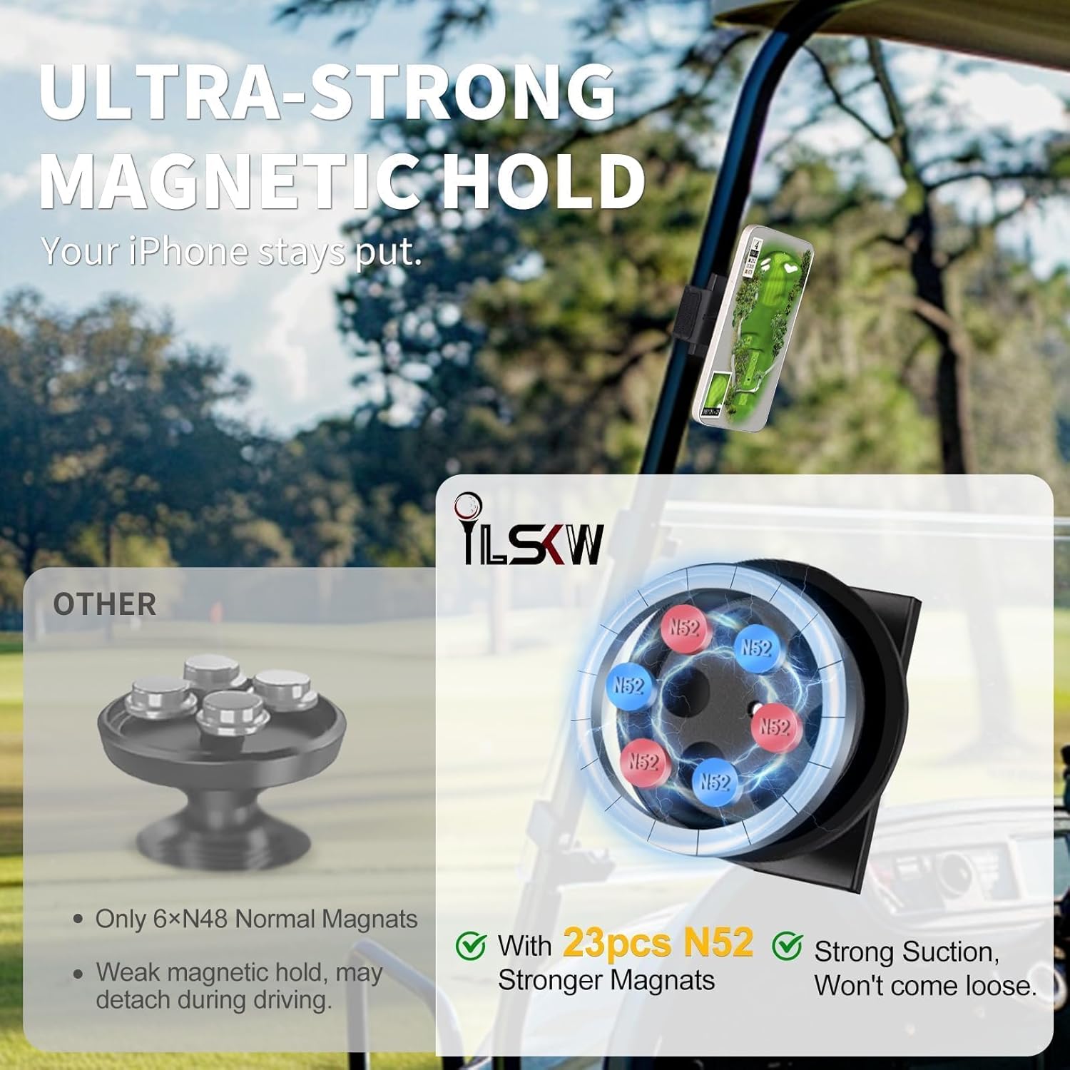 - N52 Utral Strong Magnetic: Built with a double-sided N52 magnet design, the magnetic golf cart phone holder delivers rock-solid stability. Round magnet enhances grip when used with the included metal plate on your phone. And the square magnet and Velcro strap provide double security—keeping the magnetic phone holder securely mounted even on rough roads or at high speeds