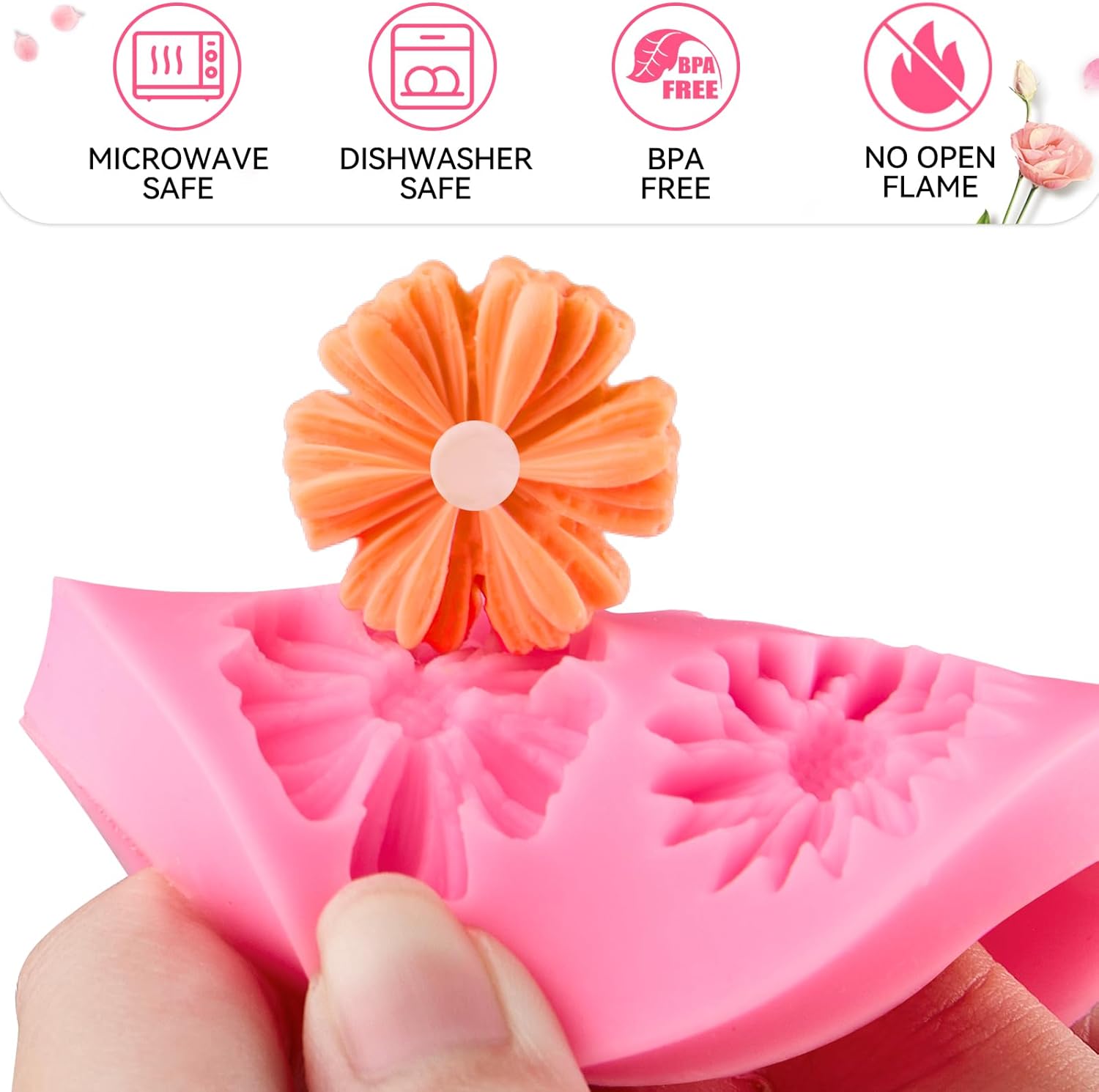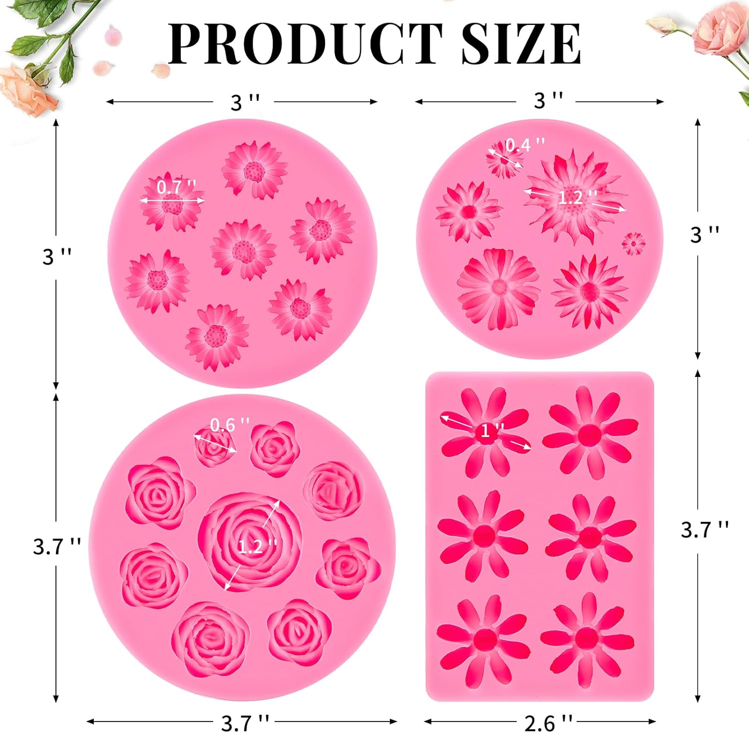 4 Pcs Flower Silicone Fondant Molds, Daisy Rose Flower Chocolate Candy Molds for Cupcake Topper, Cake Pop Decoration and Clay Craft Making