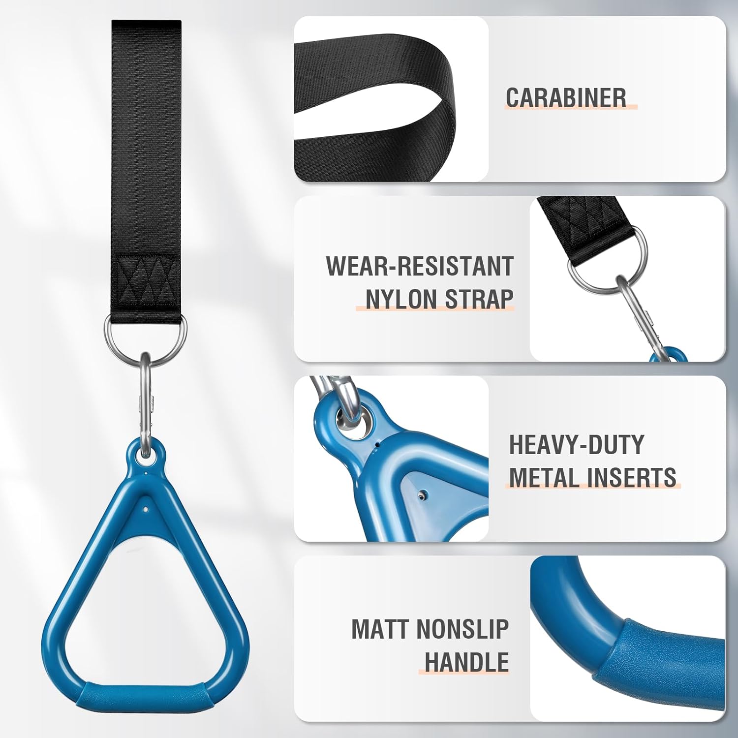 - 【HOLD UP TO 250 LBS】- With metal inserts and heavy-duty carabiner, these ABS gym rings can hold a weight up to 250lbs, ensuring kids and adults play or train with peace of mind — no ripping, no breaking