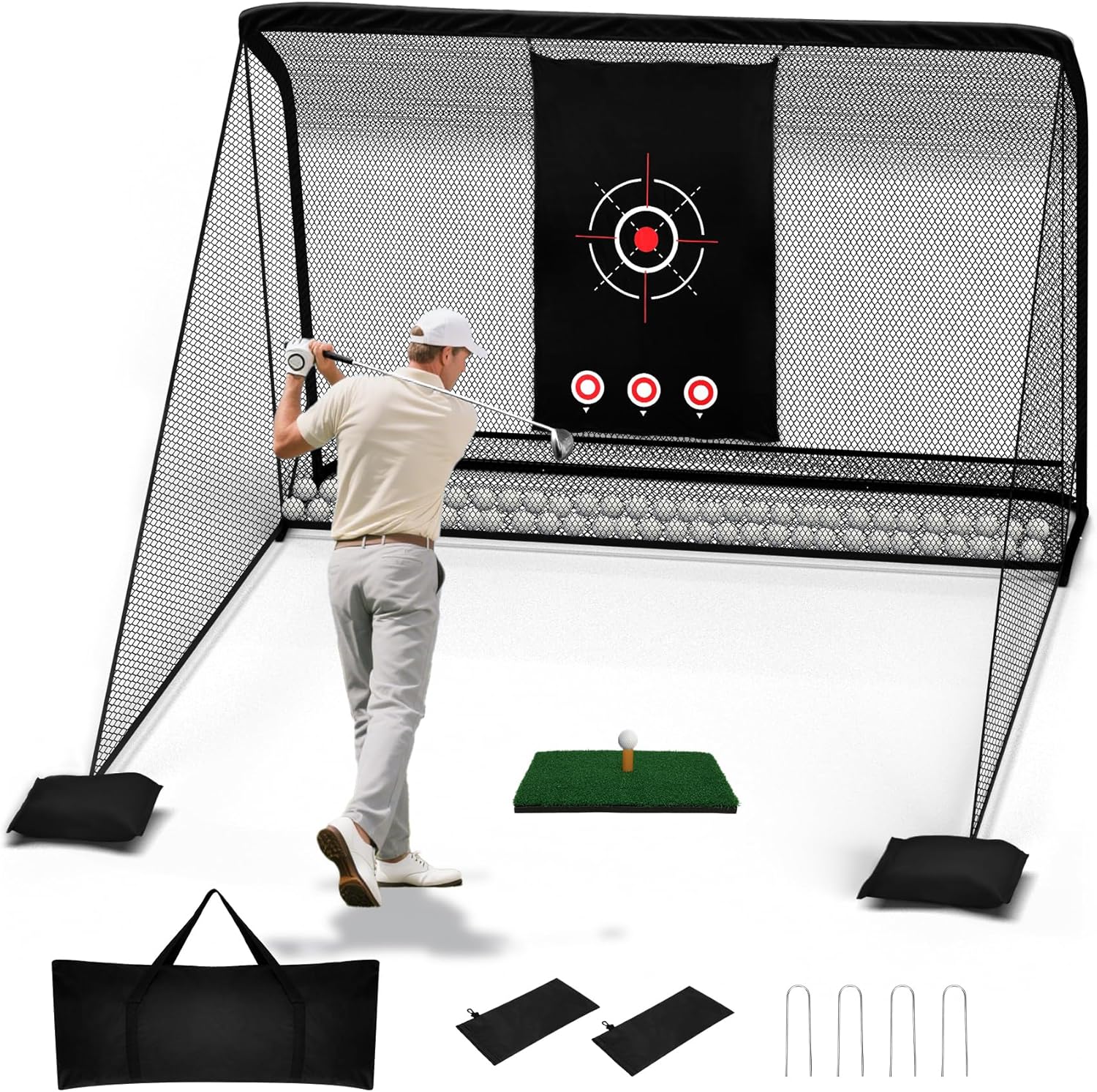 - ππππππππππ ππππ πππππππ ππππ ππππππ: This golf practice nets for backyard setup includes two large side barrier nets to capture mis-hits from any angle, making every swing saferβideal for beginners and powerful drivers alike. For unwavering stability on any surface, Golf driving net is also equipped with 2 sandbags and 4 ground stakes, locking the net firmly in place during intense practice sessions.