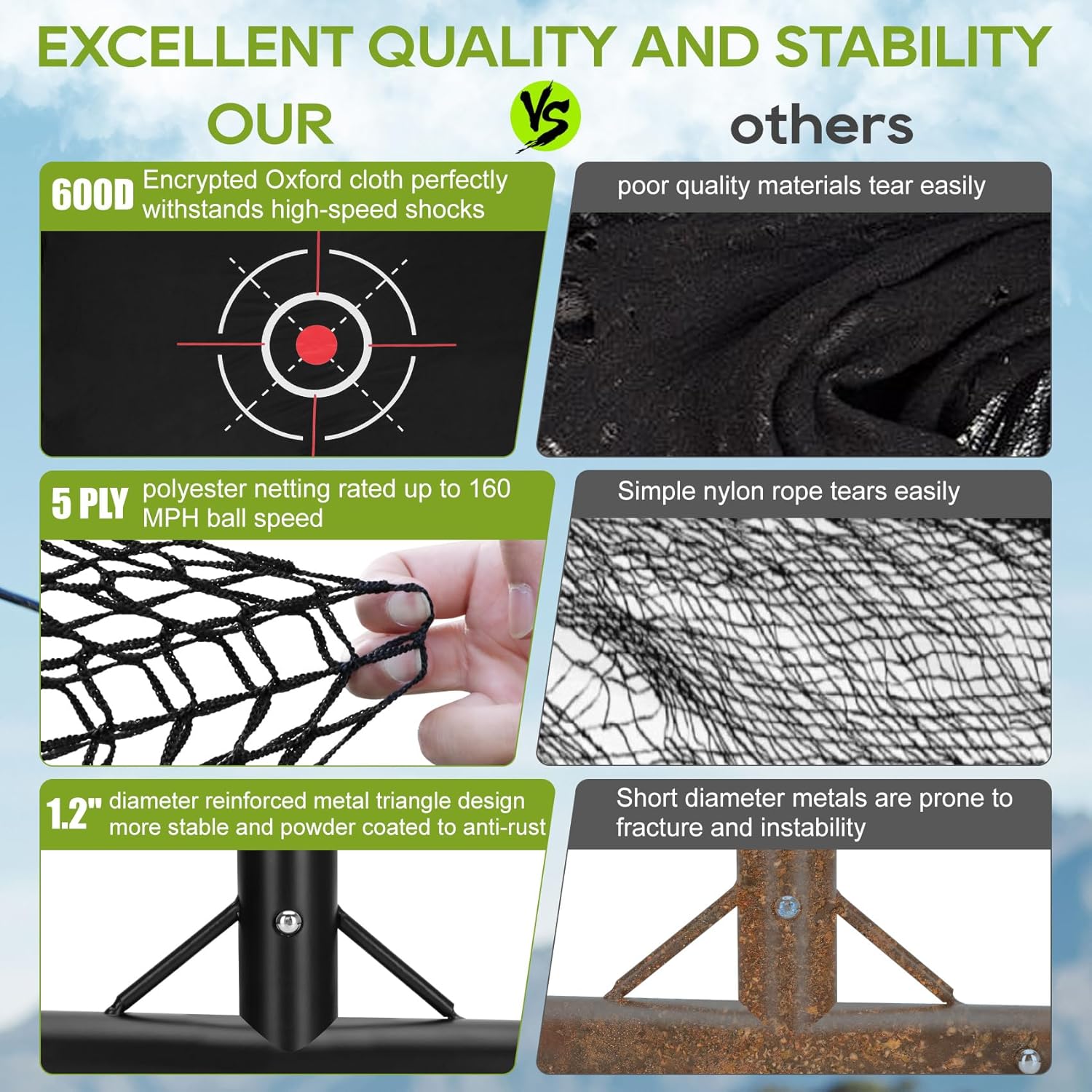 - πππππ πππππ ππππππππππ ππππππ πππππ π ππππ: Our golf practice net backyard is built to handle your most powerful drives. The heavy-duty 1.2" steel frame and triangular design create an rock-solid foundation.The 5-ply polyester netting effortlessly stops even the fastest balls, while the premium 600D Oxford cloth stands up to any weather. This 10x7ft net eats your hardest drives for breakfastβseason after season.
