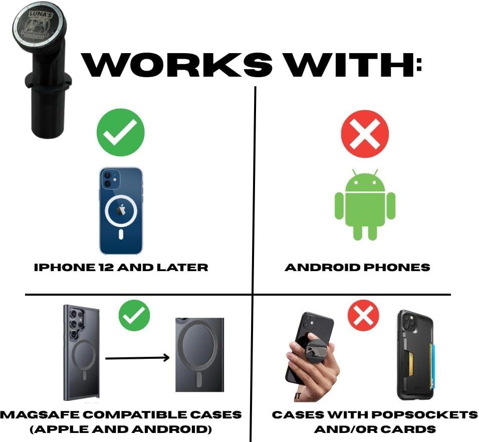 - MAGSAFE COMPATIBILITY: Features a powerful 45-pound rated magnet designed specifically for iPhone 12 and later models, ensuring secure phone mounting ADJUSTABLE VIEWING: Ball joint head with flexible neck allows customizable viewing angles for optimal screen visibility while golfing SECURE MOUNTING: Includes notched base design for elastic band attachment, providing additional stability during use and sturdy base when mounted by screw DIMENSIONS: Measures 6 inches in total height, with a 2.6-inch adjustable neck and 1.5-inch base width for sturdy support CASE COMPATIBILITY: Works with MagSafe-compatible phone cases, but not compatible with PopSockets or card holder cases