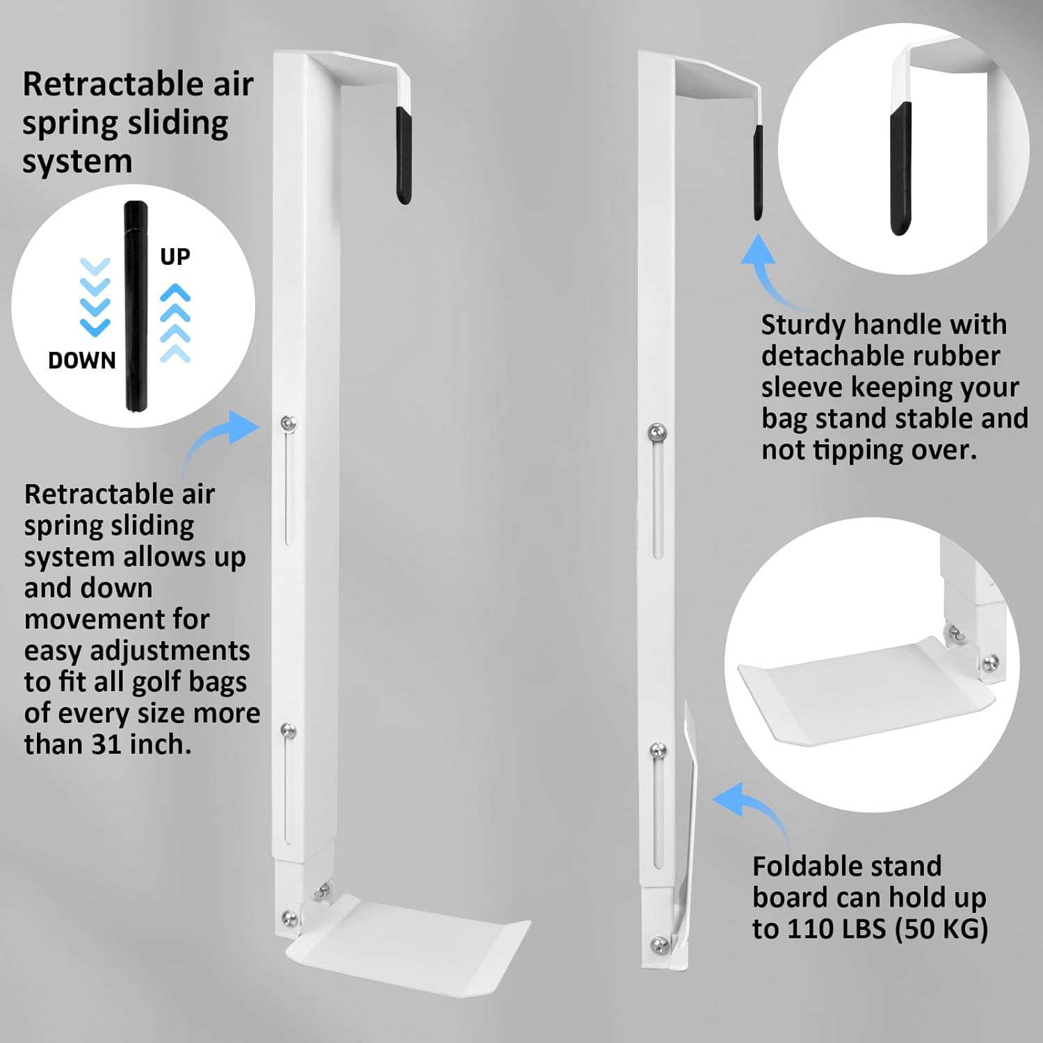 - Retractable Air Spring Sliding System Golf Bag Organizer Rack: Foldable stand board wall mount golf bag storage holder stand can hold up to 110 lbs, stability wall mount golf bag stand for storage 1 bag