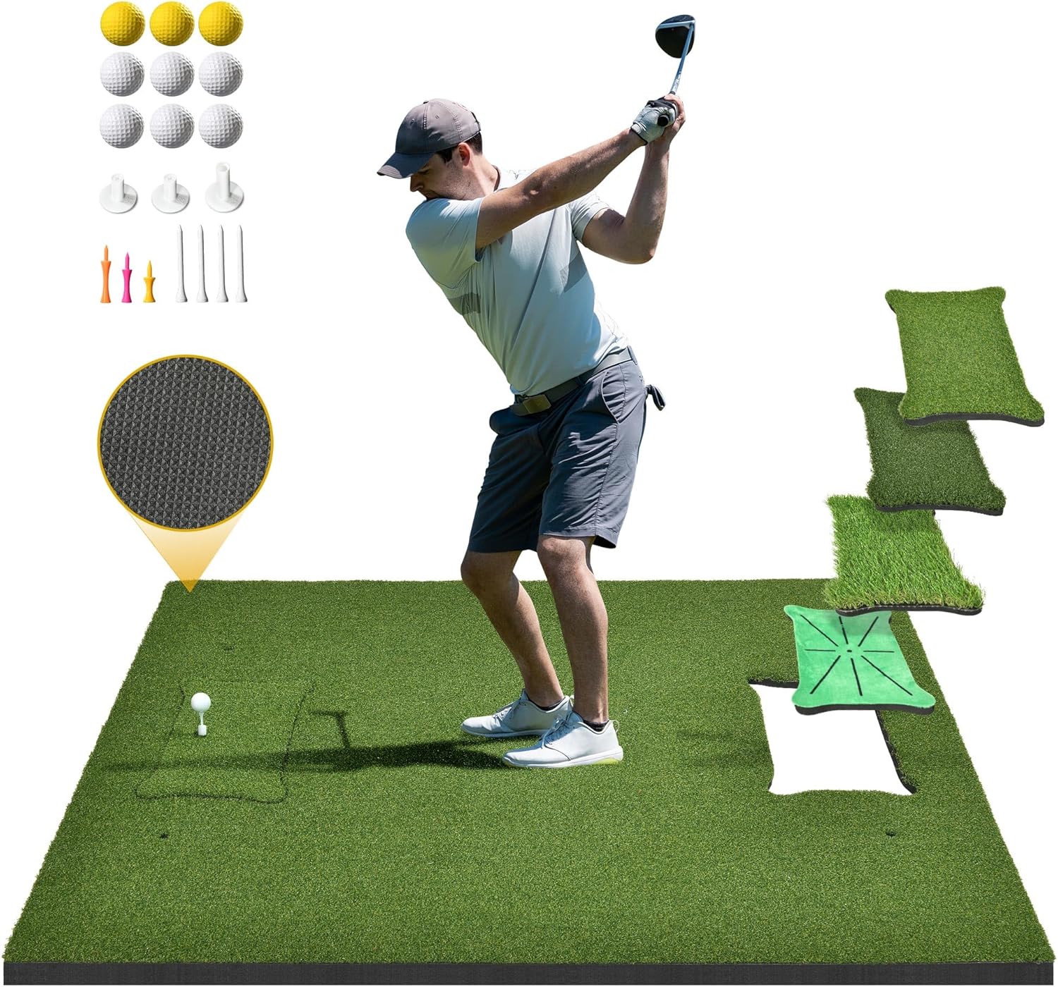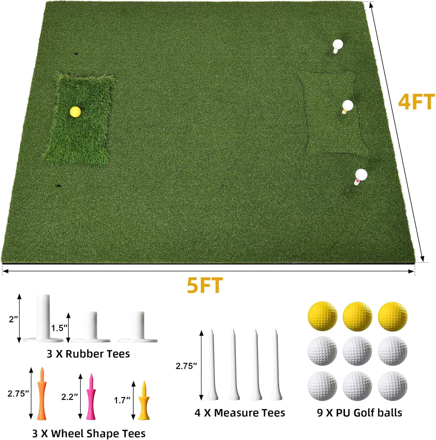 - 15mm rubber high-elastic base: This 5 x 4ft golf htting mat boasts a sturdy 15mm non-slip EVA foam rubber base for stability on any surface and 5 interchangeable batting pads for practicing key swing elements at home. Includes 9 PU golf balls, 3 tees of different sizes, and 7 golf tees, suitable for all skill levels and ages