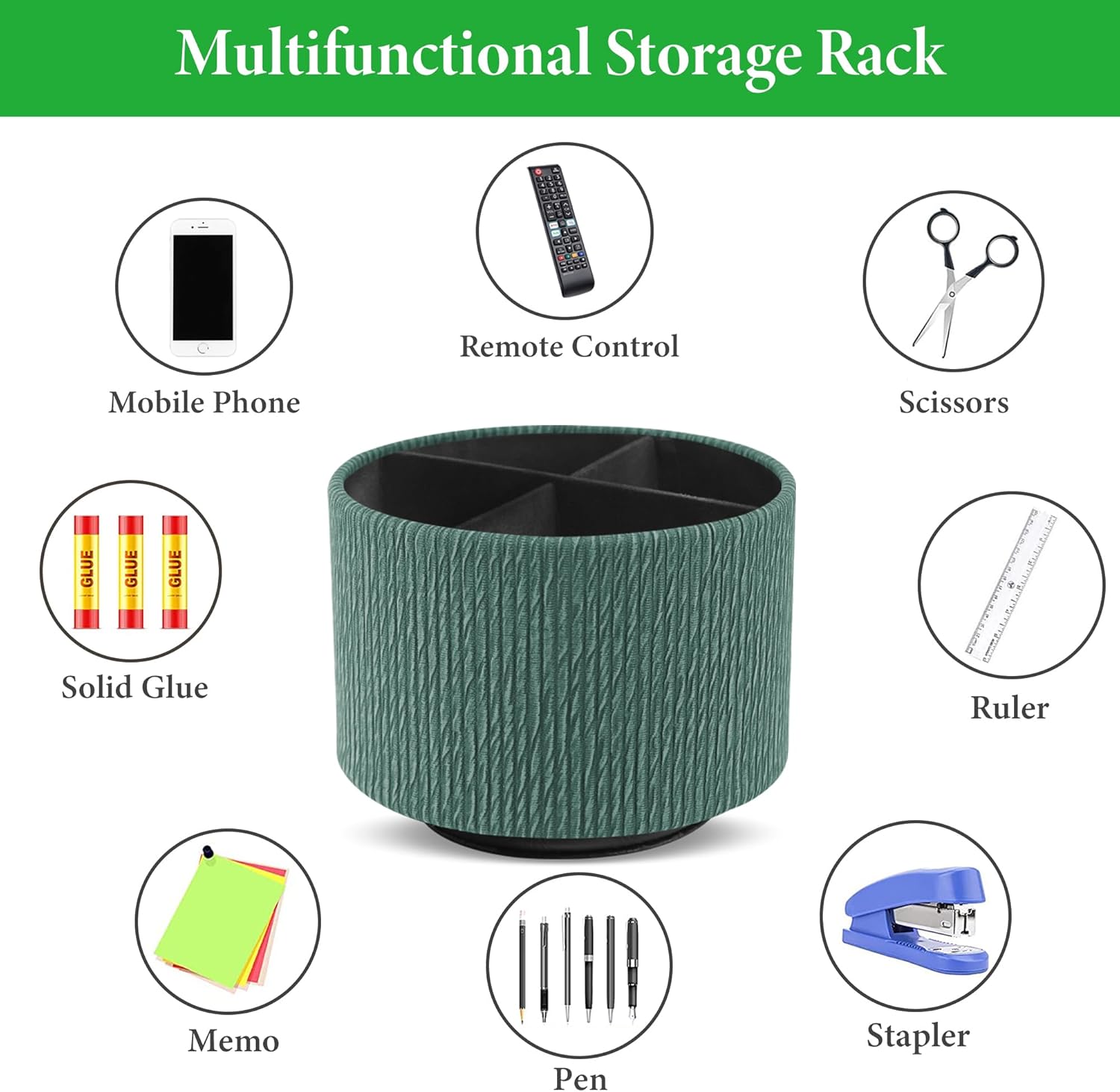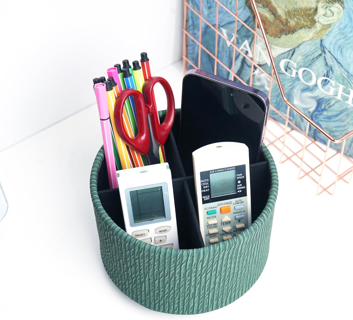 Hennaja Round Leather Art Supply Organizer,Remote Control Holder,360 Degree Spinning,Multi-Functional Pencil Holder,4 Compartments Desktop Stationary Organizer(1-Wood Green)