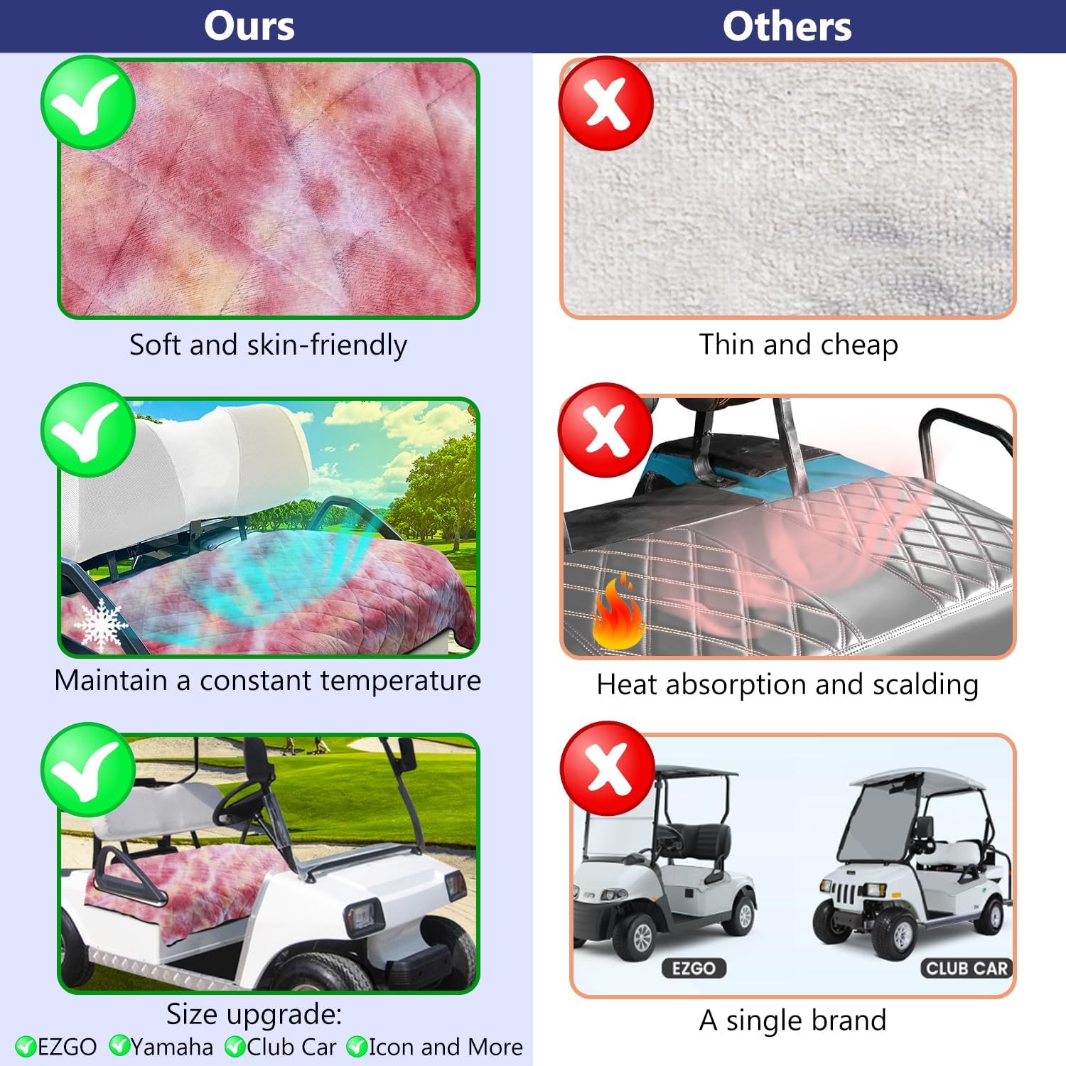 - 【Universal Size Design】51'' (L) x 30'' (H), our the golf cart seat covers is universal for EZGO, Yamaha, Club Car, Icon, Extra and so on of the 2 seater golf carts. (Please note: Due to manual measurement, there will be an error of 1 in. Measure the size of your golf cart seat before purchasing to avoid inconsistent size)