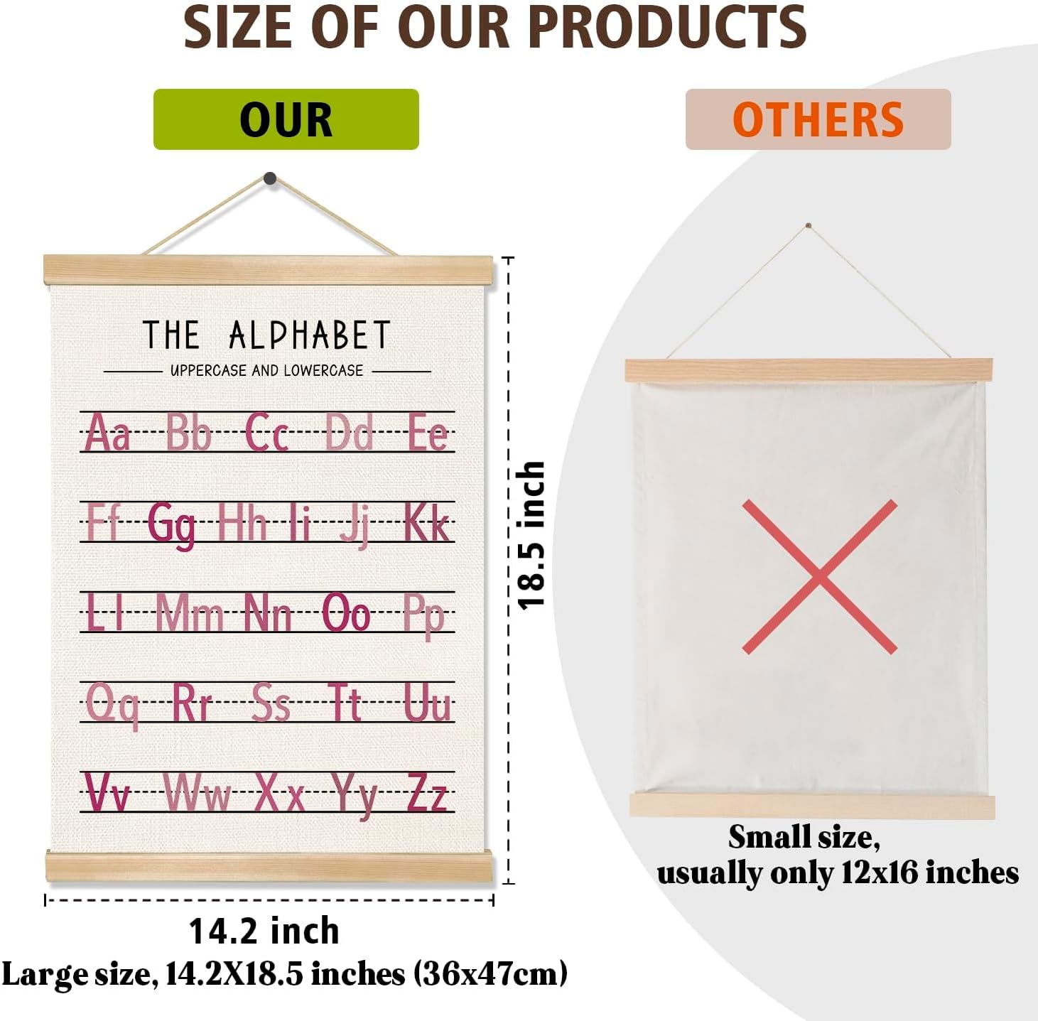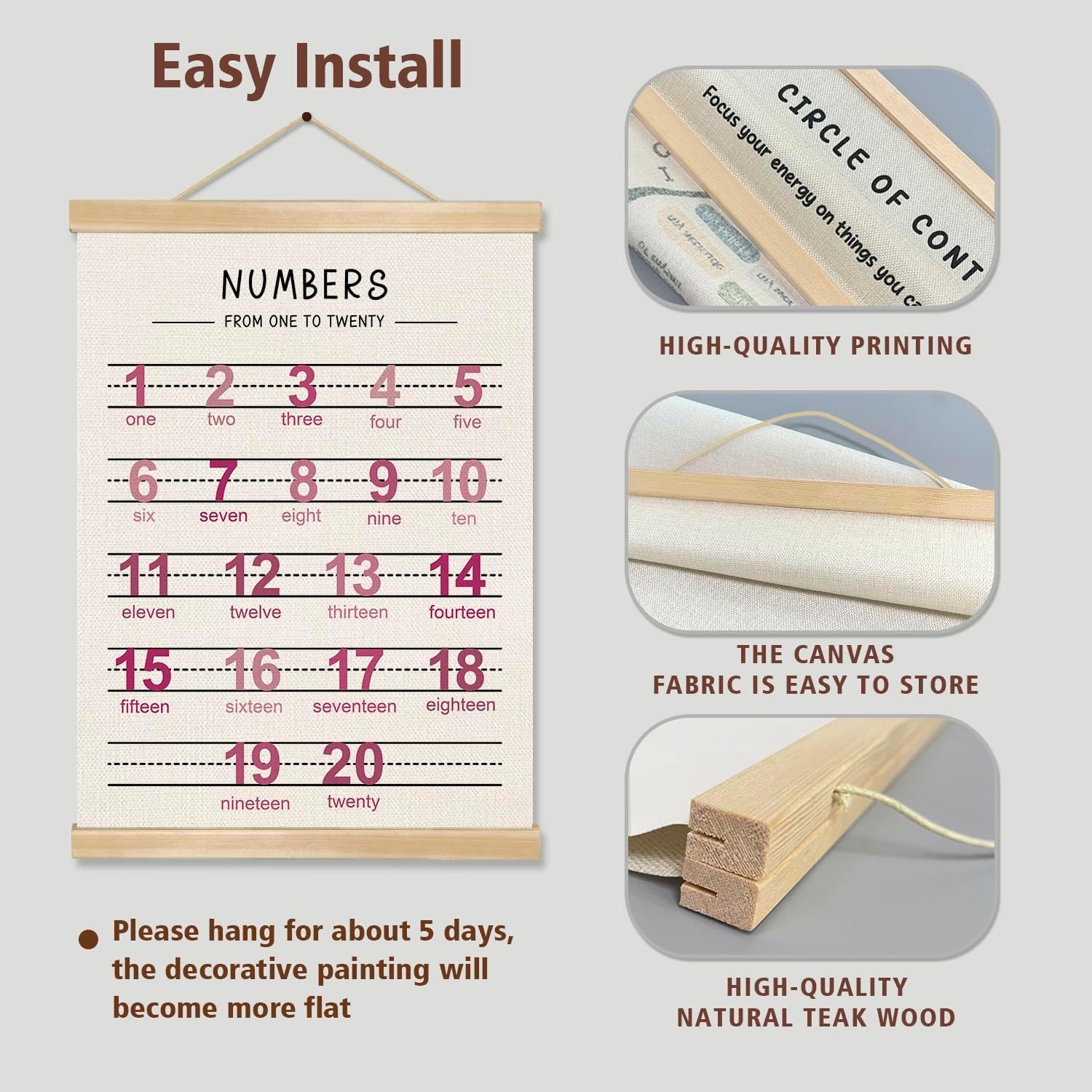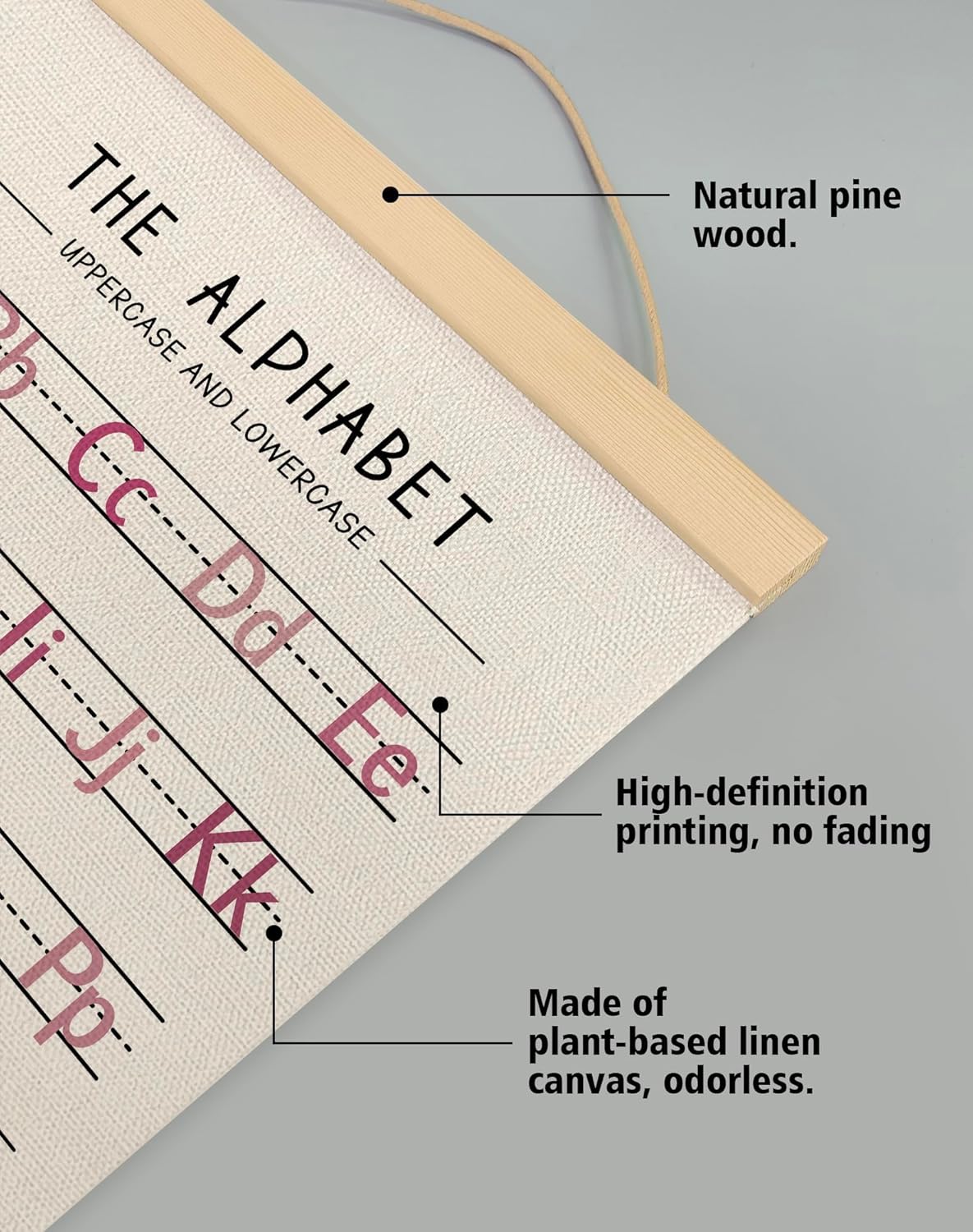 - Material & Ideal Size:Natural Linen,14 x 18.5 inches, Set of 2,one alphabet poster and one numbers 1–20 chart ,a full learning combo.These alphabet and number posters are printed on premium natural linen fabric, giving a rustic yet elegant texture.