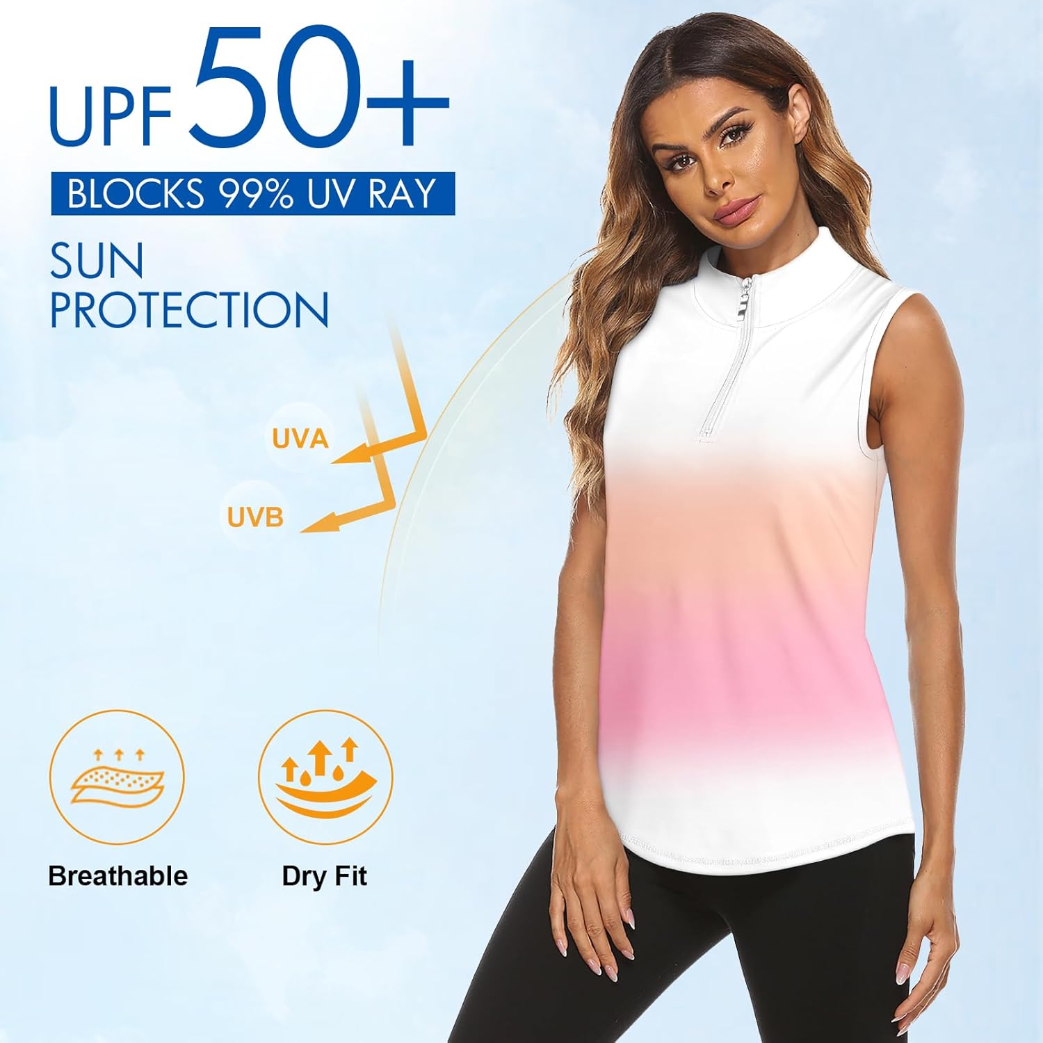 - Half Zipper Collar - Stand out from the crowd with our stand collar, sleeveless, v neck golf tank top. Half zip design allows for neck coverage, venting and easy on-off.