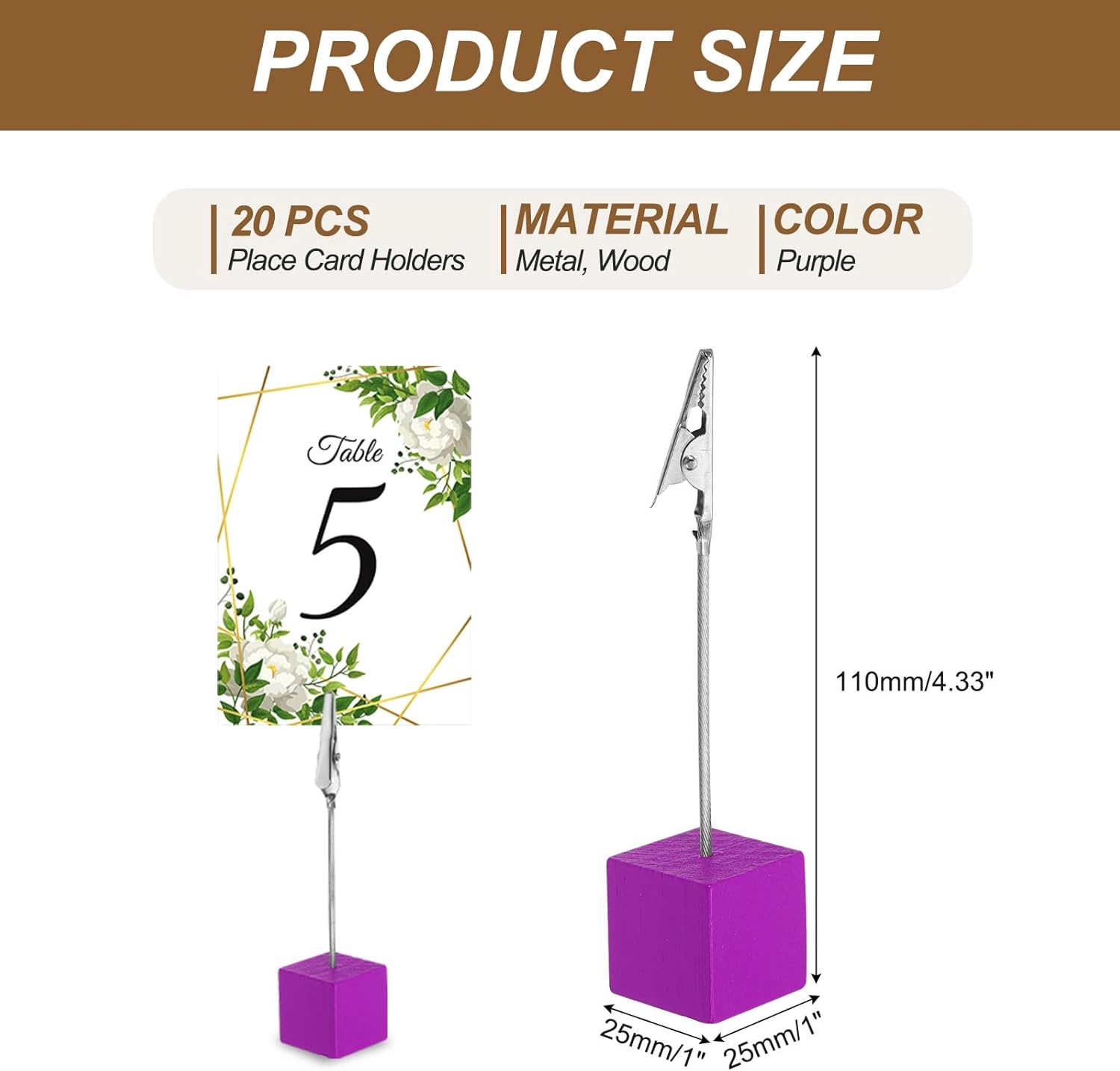 - Color: Rose Red; Material: Metal, Wood; Wire Thickness: 2mm / 0.08 inch; Overall Size: 25 x 25 x 110mm / 0.98 x 0.98 x 4.33 inch(L*W*H); Packing List: 20 x Place Card Holders for Table