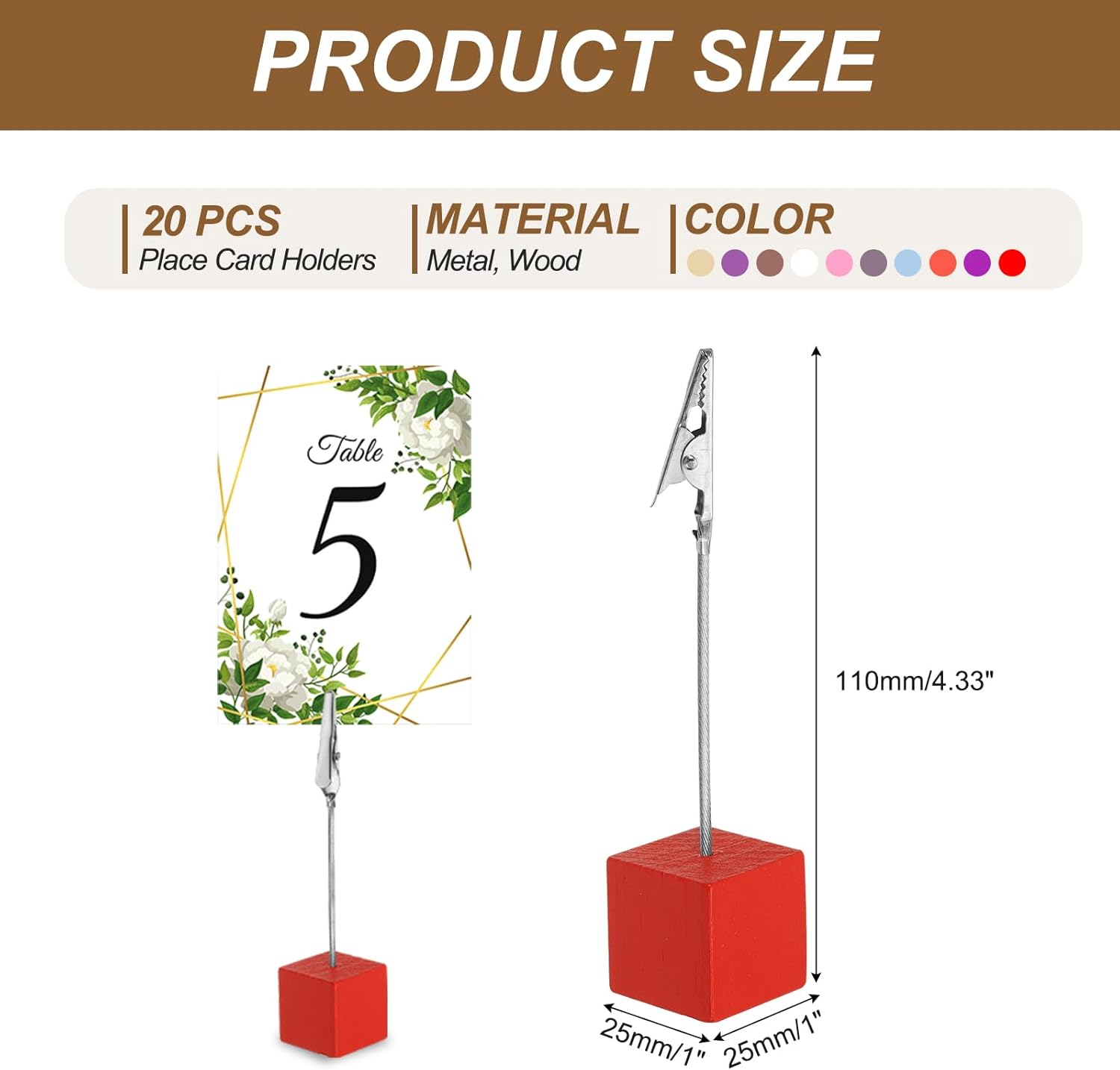 - Color: Purple, Orange, Red, Blue, Pink, White, Rose Red, Dark Pink, Dark Purple, Brown; Material: Metal, Wood; Wire Thickness: 2mm / 0.08 inch; Overall Size: 25 x 25 x 110mm / 0.98 x 0.98 x 4.33 inch(L*W*H); Packing List: 20 x Place Card Holders for Table
