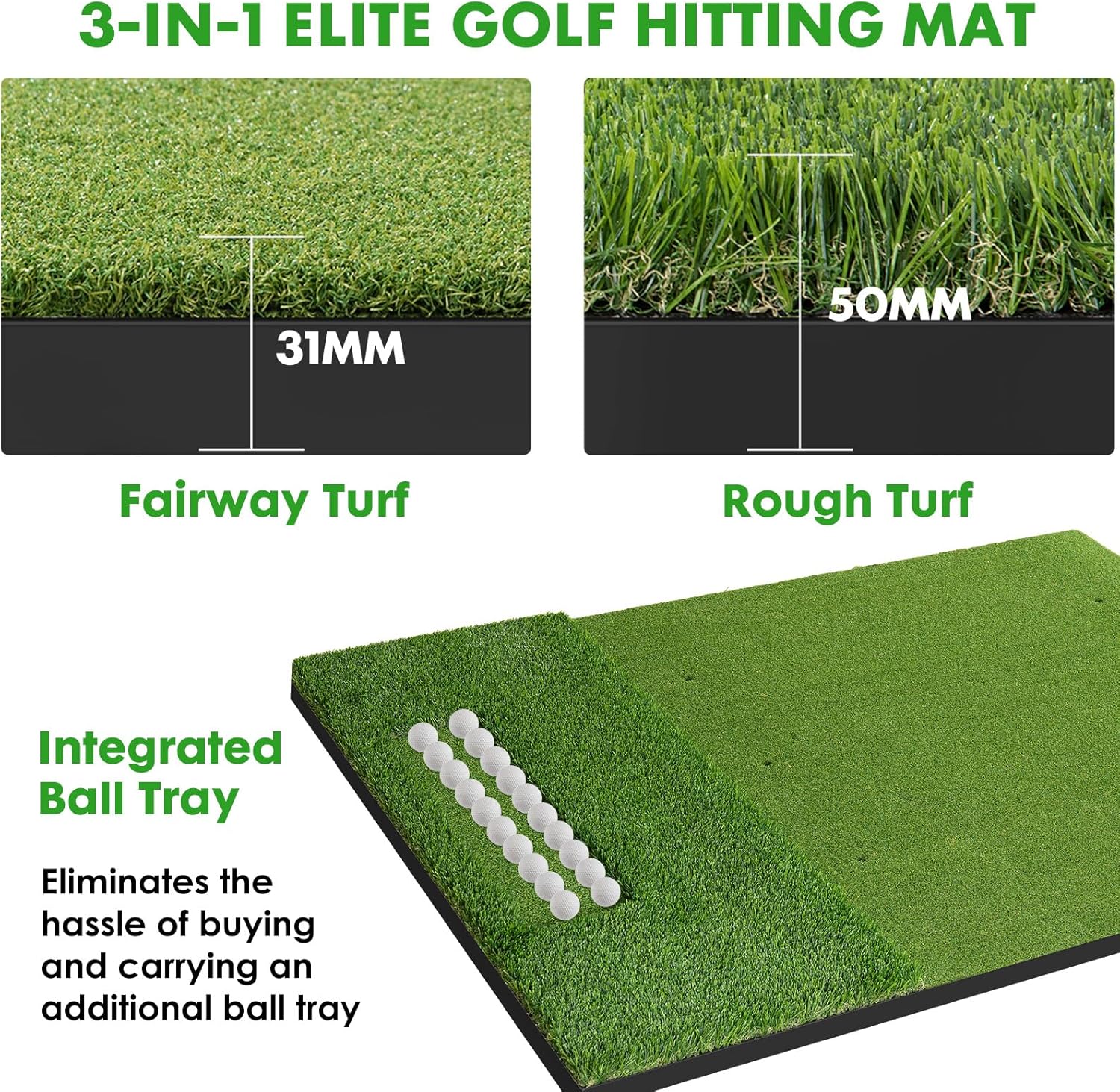 - HIGH-TENACITY TURF: Engineered with 16mm & 35mm high-density artificial grass, our golf simulator mat is robust enough to endure powerful swings while maintaining excellent condition even after extended use. It keeps your clubs clean and residue-free, ensuring long-lasting durability and reliable performance for countless rounds of play
