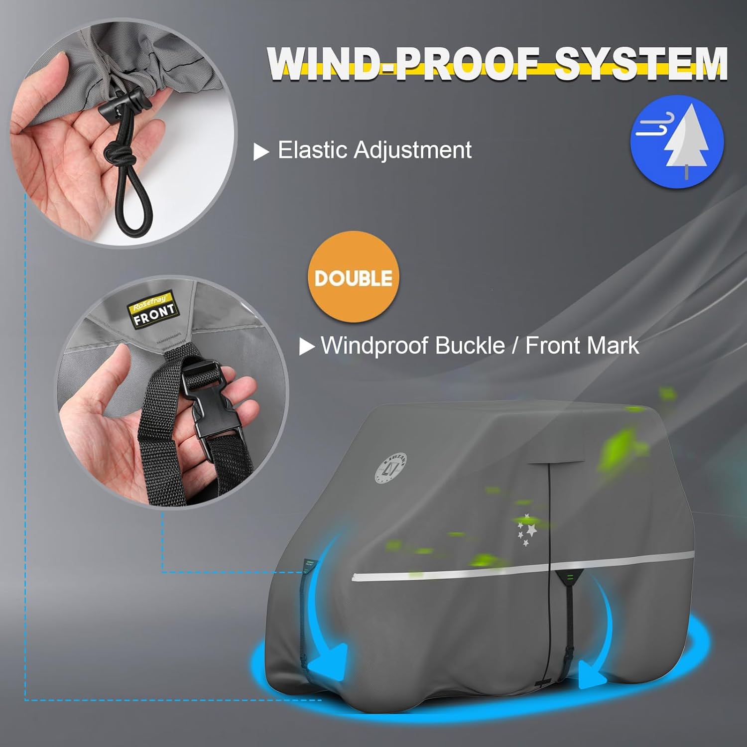 - Unique Exterior Design: ①Clever color matching and wonderful pattern embellishment design,Make your golf car cover stand out. ②Front,rear,left,right has adjustable windproof buckles,Adjustable Hem Cord,all-round windproof. ③Reflective strips on both sides have a night warning effect.