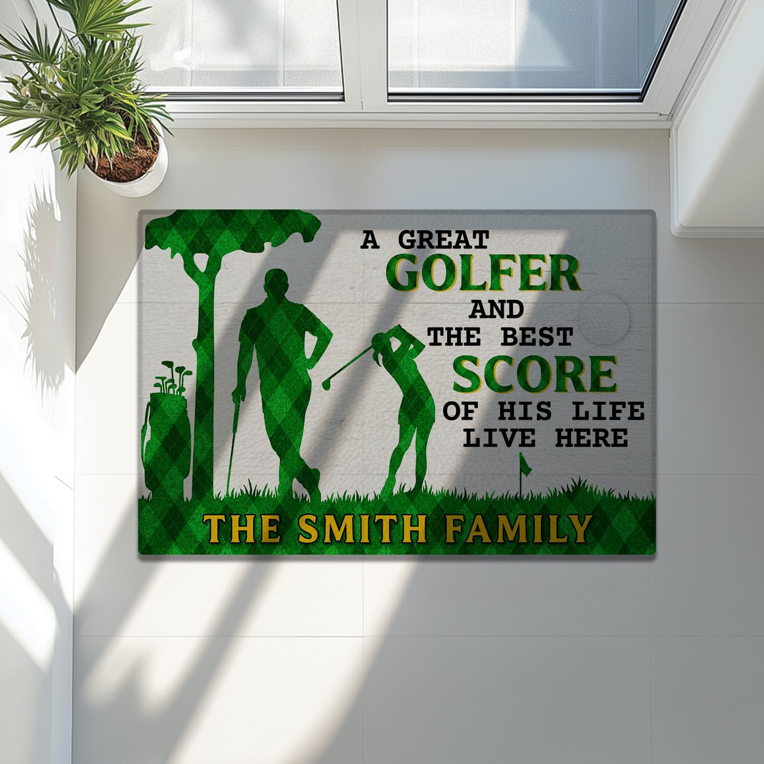 - FUNNY GOLF DOORMAT FOR COUPLES WITH PERSONALIZED FAMILY NAME Showcase your love for golf and each other with this doormat that proudly declares: “A great golfer and the best score of his life live here.” The quote blends humor with affection, celebrating both a passion for the sport and the joy of partnership. Add your family name to make it uniquely yours—a personal touch that turns every entryway into a conversation starter.