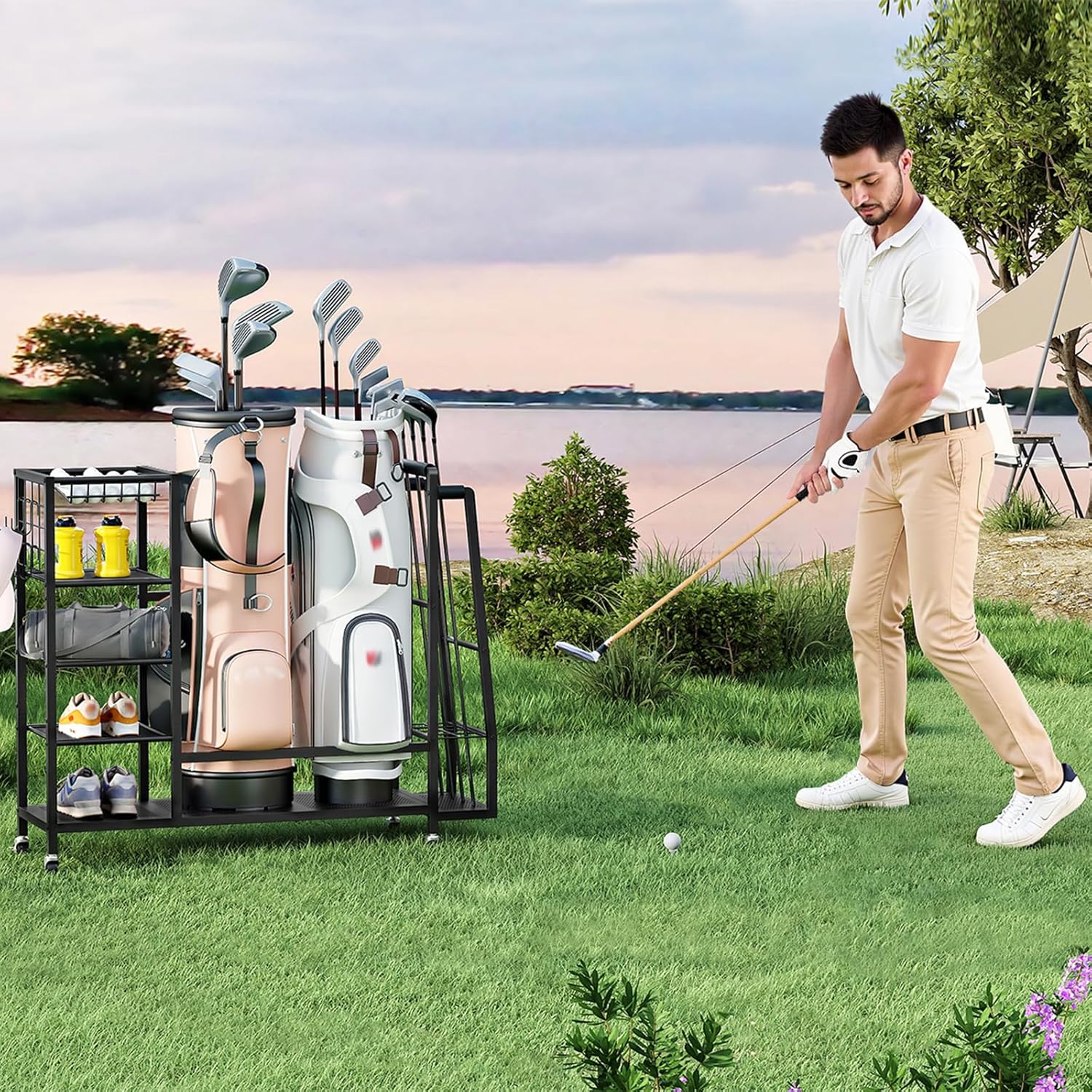 - Organized Layout: Designed with 5 S-shaped hooks for hanging caps and towels, a side club holder holds up to 8 golf clubs, with the rubber covers preventing scratches, and 4 mesh shelves for shoes and athletic wear, our golf rack ensures an organized space