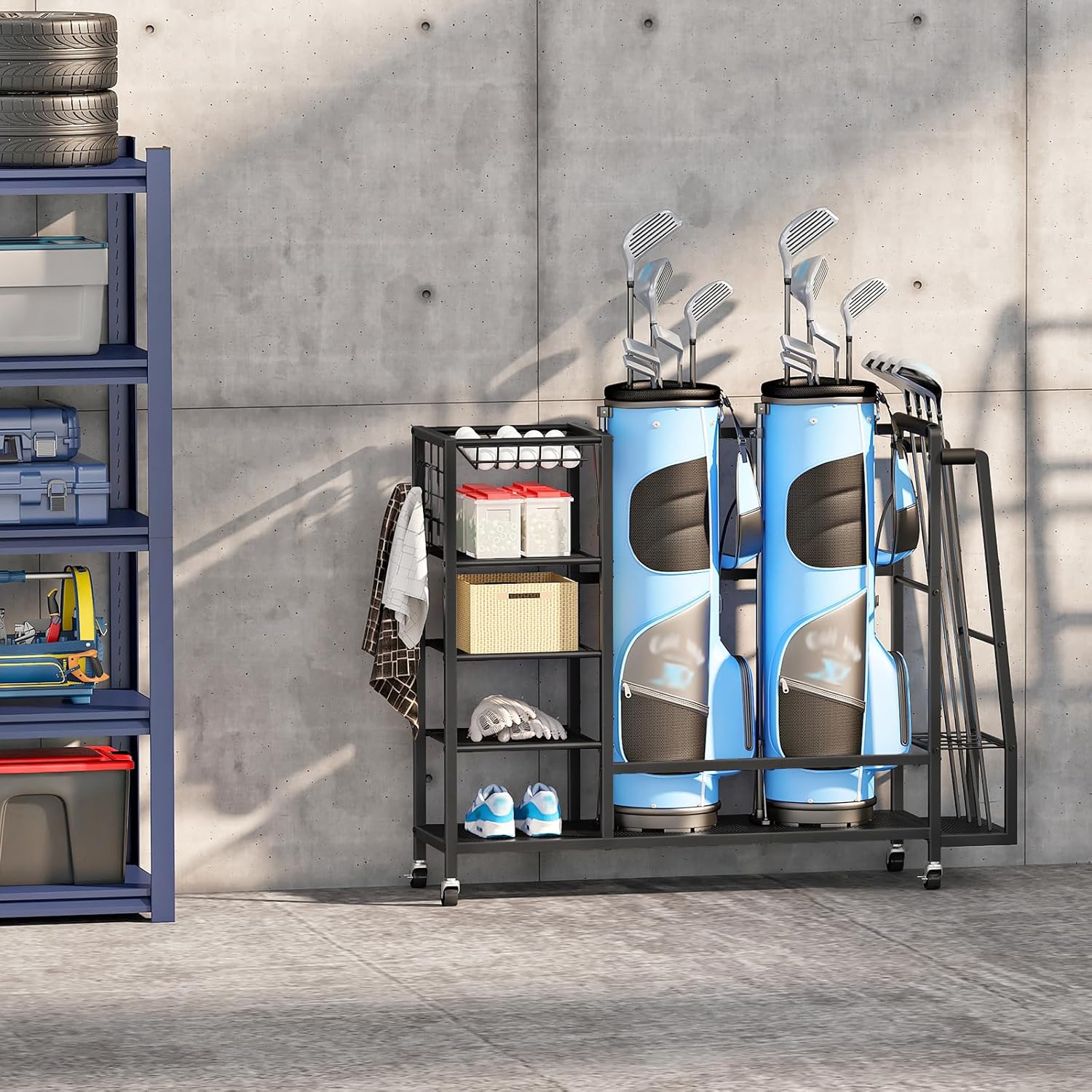 HOOBRO Golf Bag Storage Garage Organizer, Golf Bag Storage Stand Fits 2 Golf Bags and Golf Equipment Rack with Wheels, Extra Storage Rack for Garage, Club, Basement, Black BK49CJ01
