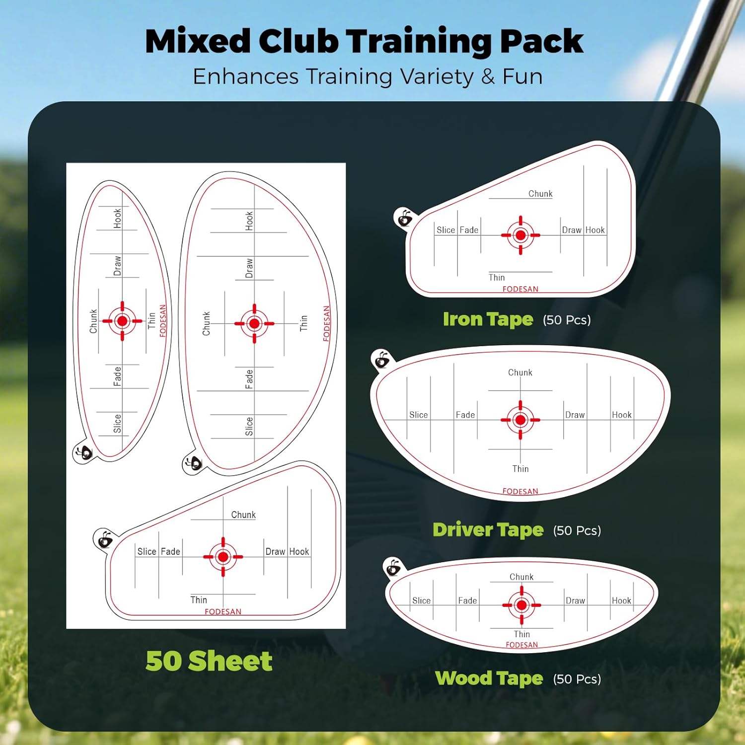 - 【Mixed Club Pack & RH/LH Options】150 stickers total: 50 Driver + 50 Iron + 50 Wood, plus 5 Training Sheets (1 Exam, 2 Friend Challenge, 2 Target Drill). Right-Handed / Left-Handed variants available. Exclusive in every pack.