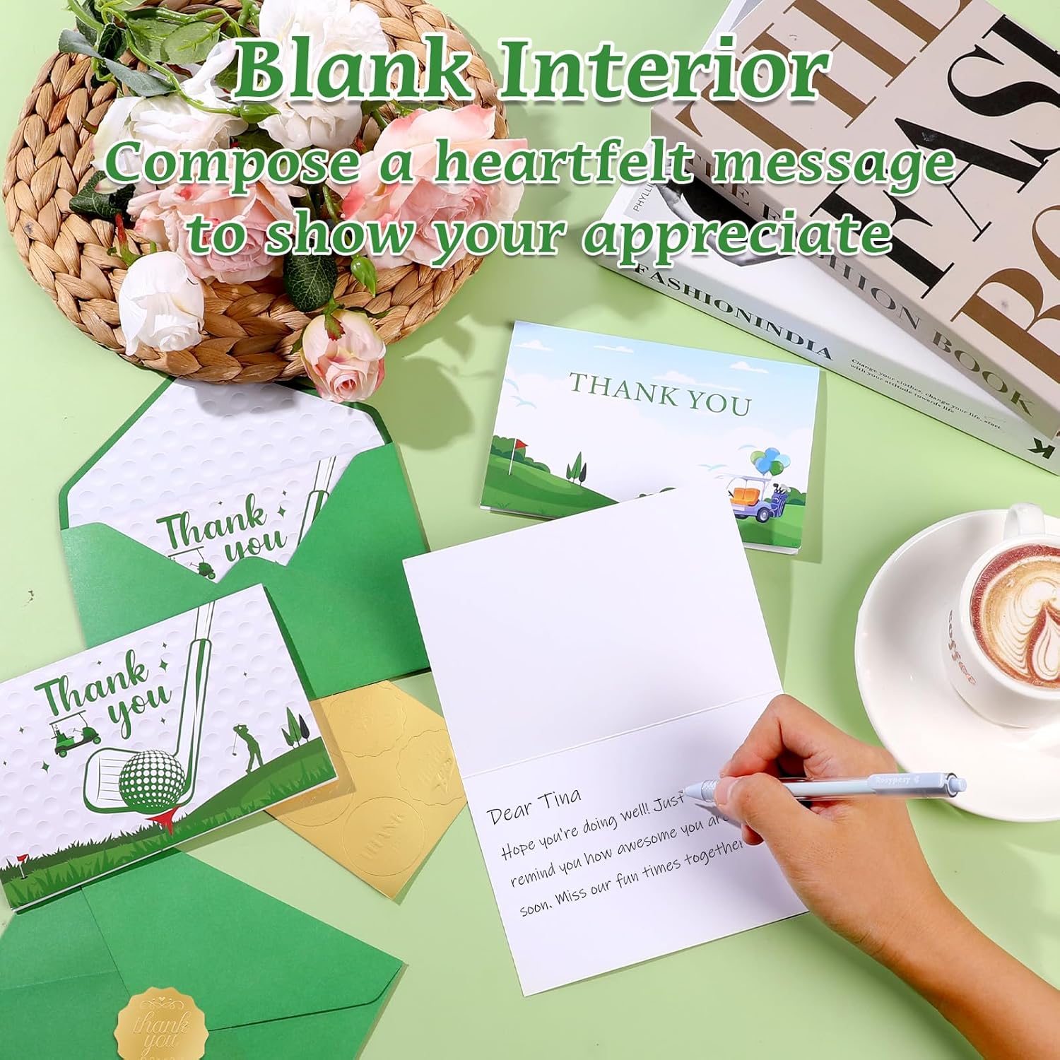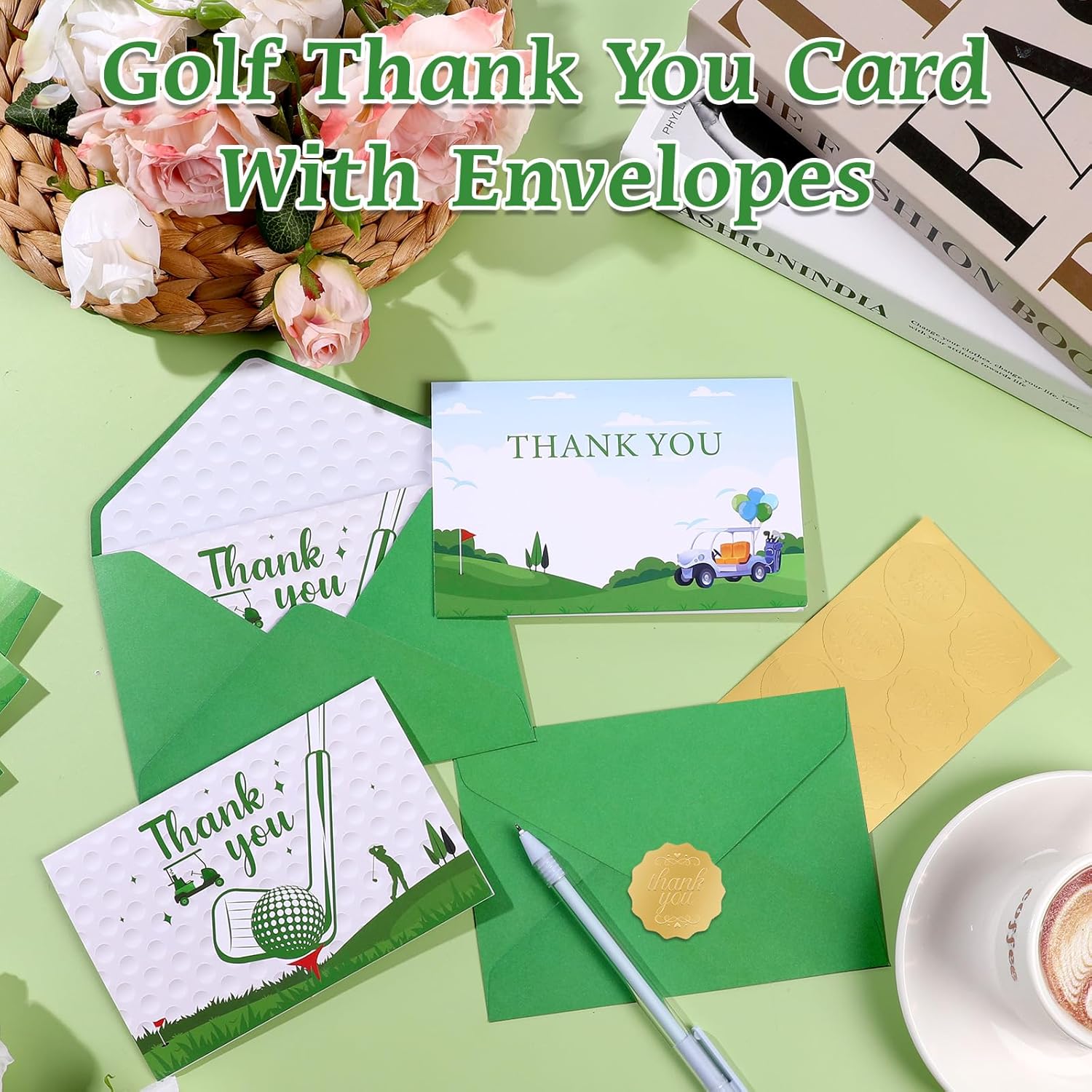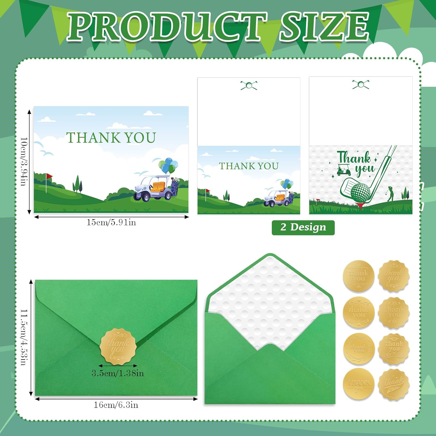 NEWEST 24 Pieces Golf Thank You Cards, 2 Design Golf Greeting Card with Envelopes & Stickers Green White Golf Blank Note Cards for Sports Theme Birthday Baby Shower Retirement Party Favors