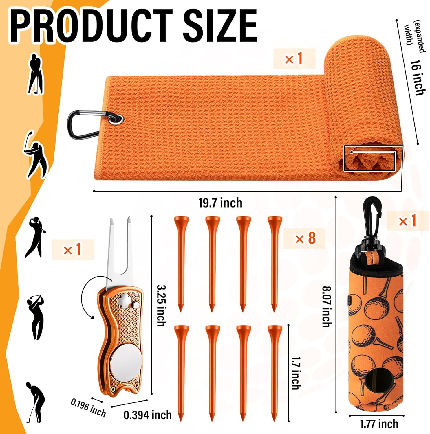 - Nice Combination: you will receive a complete set of bright orange yellow golf accessories, including orange golf ball bag, orange golf towel, 8 golf tees, 1 cleaning brush with a retractable zip, 1 heavy duty divot tool, enough to meet your needs; These orange designs are represented passion, energy and sportsmanship; Owning this set can allow you to show your unique style on the course, reduce sports pressure, and convey a relaxing atmosphere