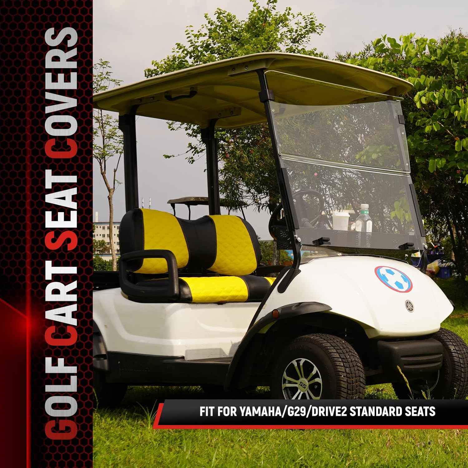 - 【Golf Cart Front Seat Covers】: Golf cart front seat covers contain 2pc seat covers( one backrest seat cover and one bench seat cover),suitable for yamaha g29/drive/drive 2 2007-up OEM ordinary YD type front seat cushion, not for the modified or luxury thick seat cushion. Please measure your seat before ordering. There will be a little differences between the real size and the manual measurement.