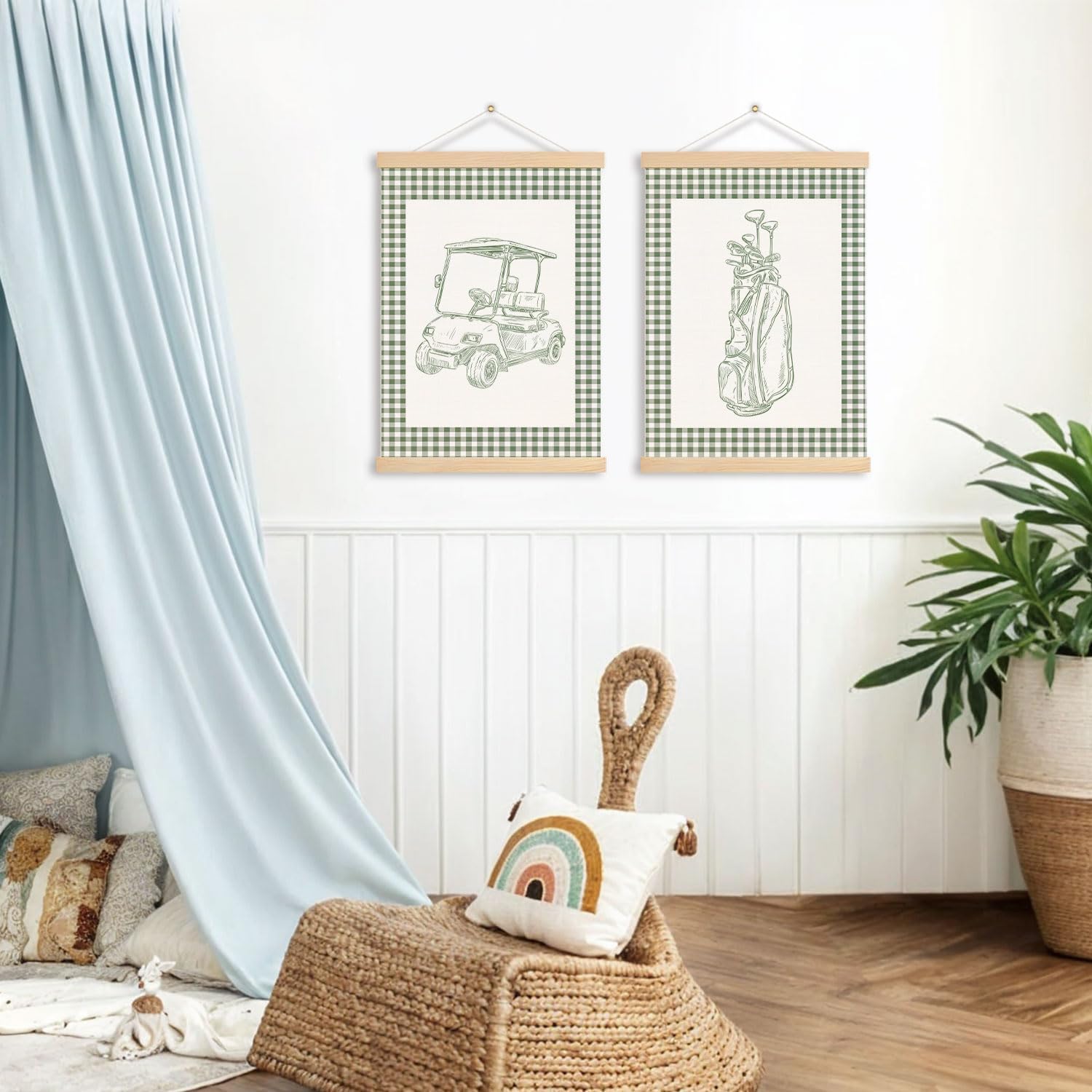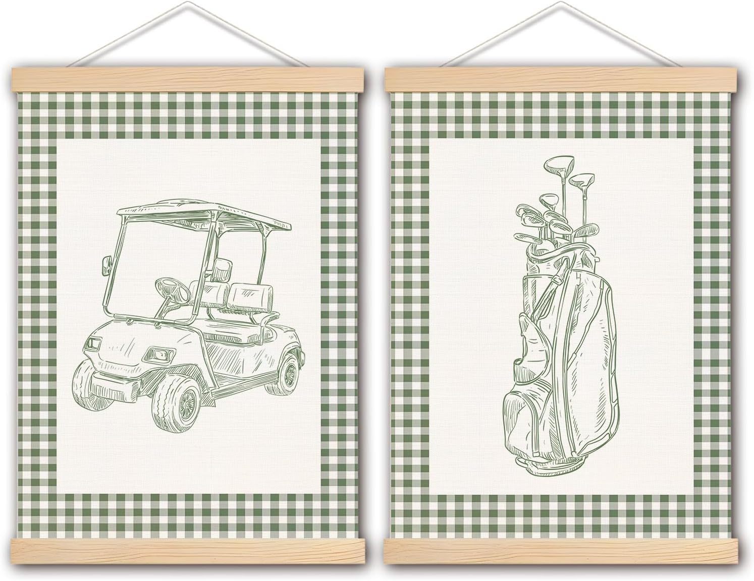 DNEULYR Sage Green Checkered Golf Wall Art Poster, Golf Nursery Wall Decor, Retro Golfing Golfer Poster Hanger Frame for Kids Boys Room Bedroom Nursery Playroom, 12x16 Inches Set of 2