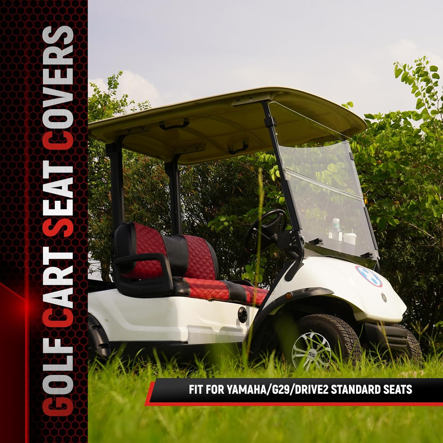 - 【Golf Cart Front Seat Covers】: Golf cart front seat covers contain 2pc seat covers( one backrest seat cover and one bench seat cover),suitable for yamaha g29/drive/drive 2 2007-up OEM ordinary YD type front seat cushion, not for the modified or luxury thick seat cushion. Please measure your seat before ordering. There will be a little differences between the real size and the manual measurement.