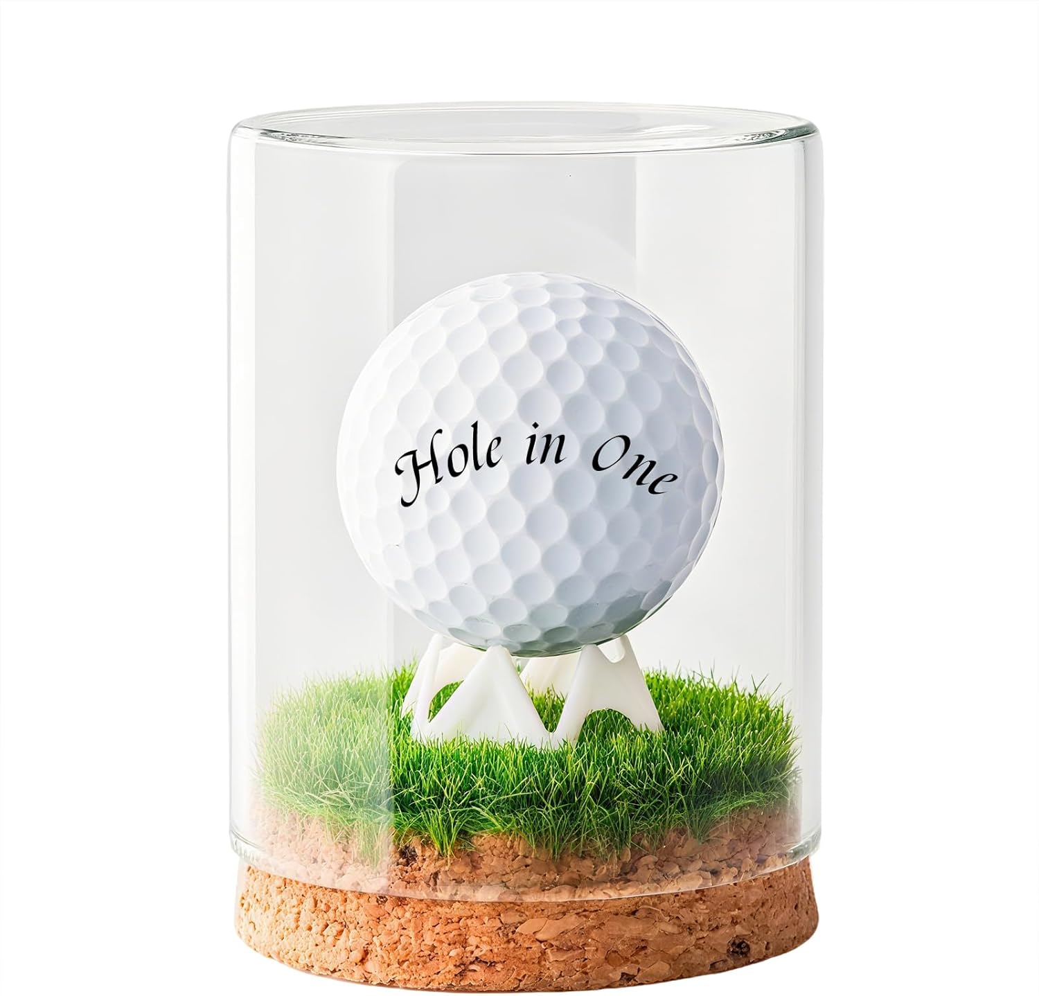 Rocalt Golf Ball Display Case, Hole in One Golf Ball Display Case, Clear Glass Golf Ball Holder with Cork Base, Lifelike Turf, and Plastics Tee, Golf Gifts Decor