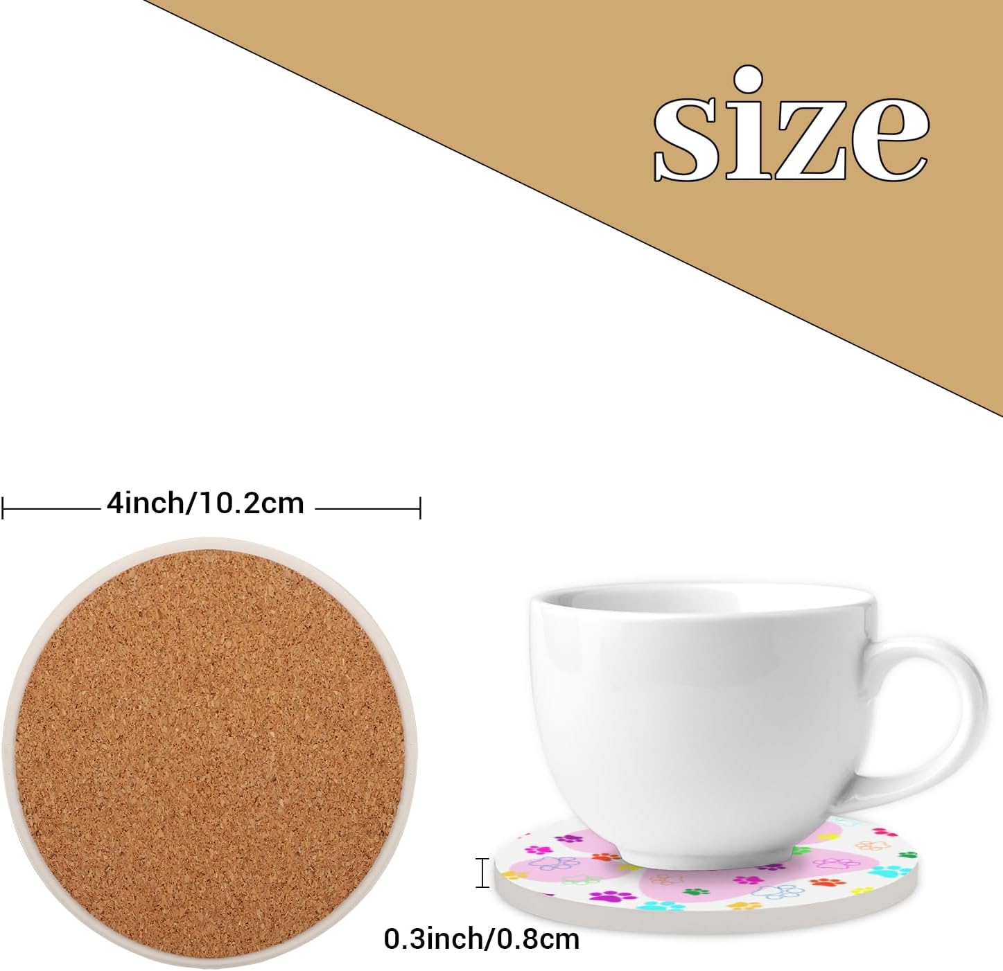Ceramic Coasters for Drinks with Cork Back,Colorful Paw Prints On Pink 4 Inch Absorbent Coaster Set 4 Pack, Quick Dry Non-Slip Coaster Mats for Home, Office, Bar