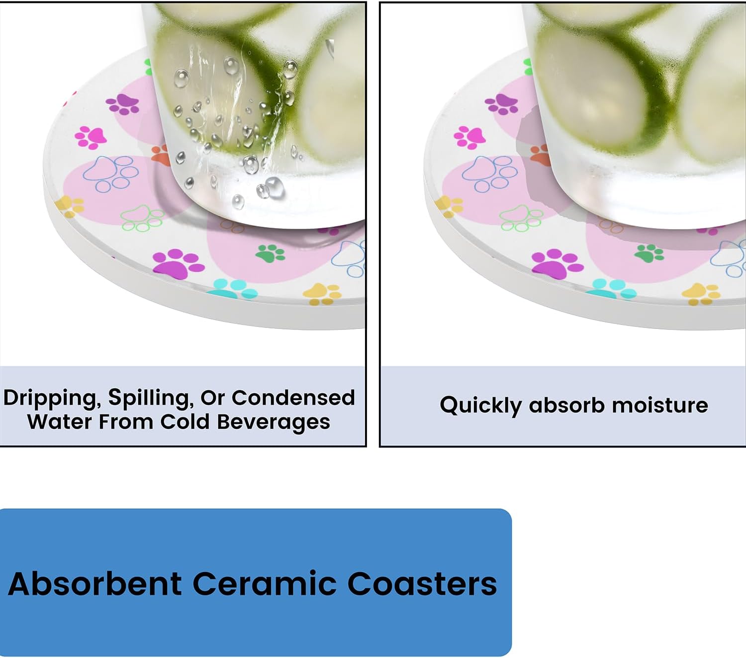 Ceramic Coasters for Drinks with Cork Back, Colorful Paw Prints On Pink 4 Inch Absorbent Coaster Set 1 Pack, Quick Dry Non-Slip Coaster Mats for Home, Office, Bar