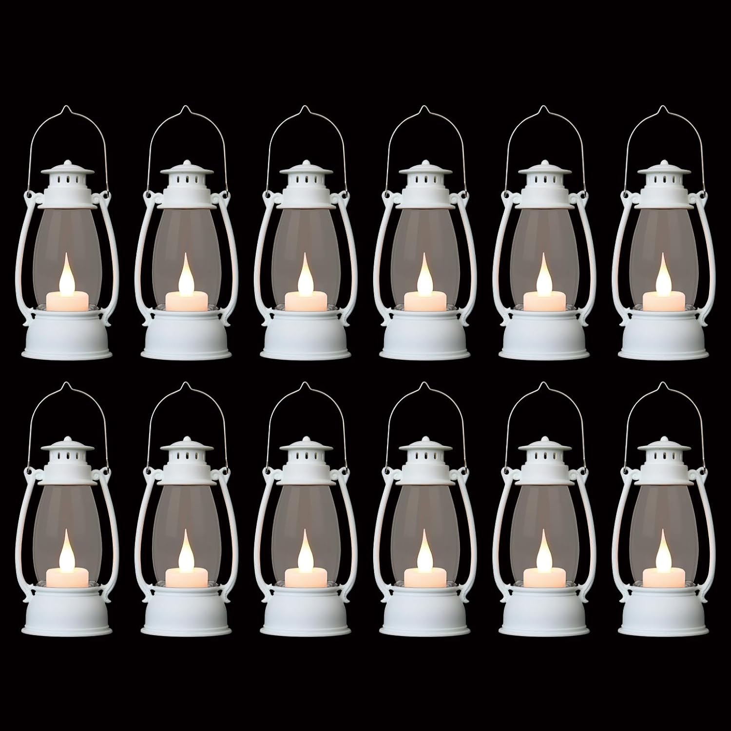 12Pcs Mini White Lanterns for Western Halloween Christmas – 6Inch Candle Lanterns with Flickering LED, Wedding Centerpiece Table Decorations, Camping Decor & Hanging Ornaments for Rustic Party