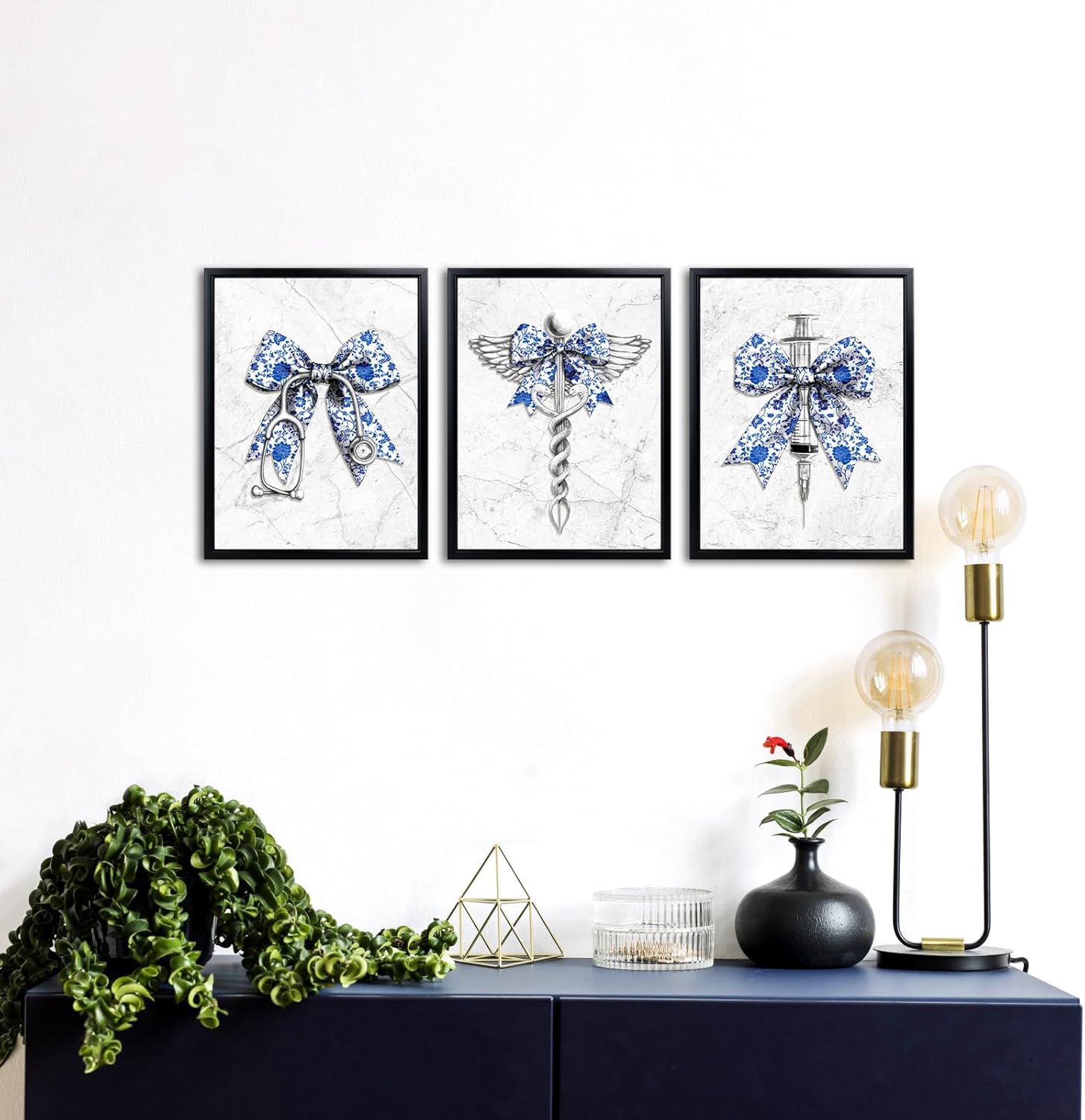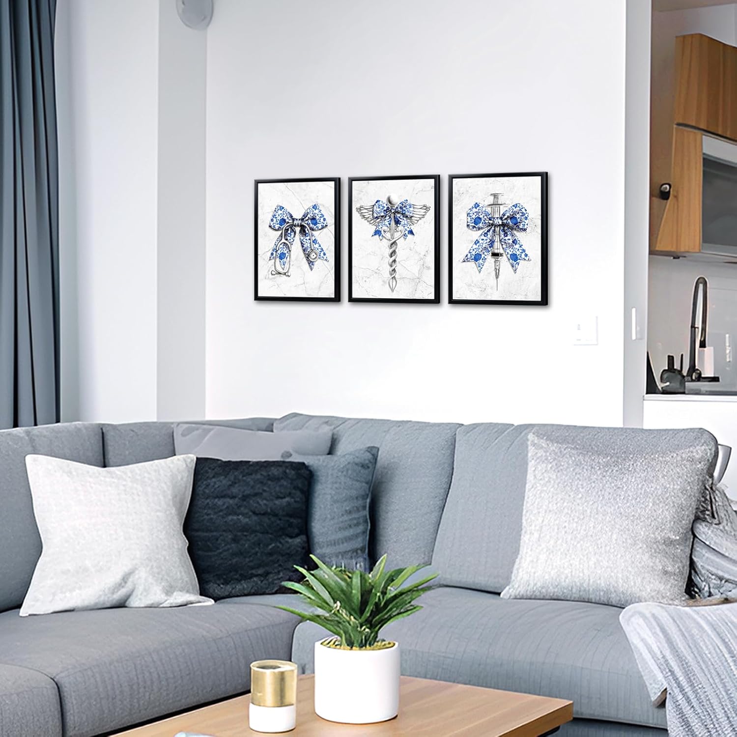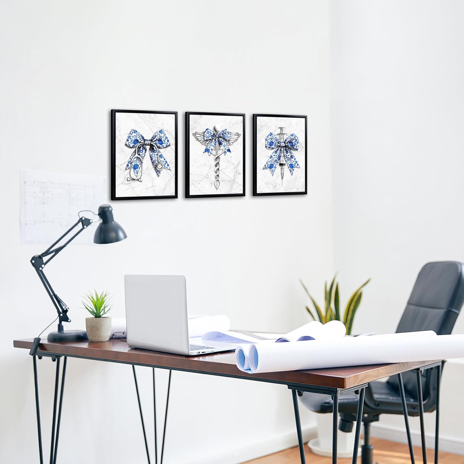 - Set includes three 12x16 inch panels featuring original medical-themed artwork with blue and white porcelain-style bows
