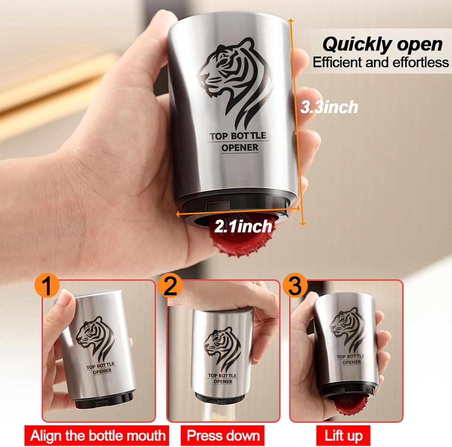- 【Spring-Loaded Beer Bottle Opener】 Effortlessly remove caps! Place, press, release—instantly open bottles. Built-in magnet catches caps mid-air, keeping them flawless for collectors. Durable, quick, and bend-free—perfect for BBQs, bars, or collections.
