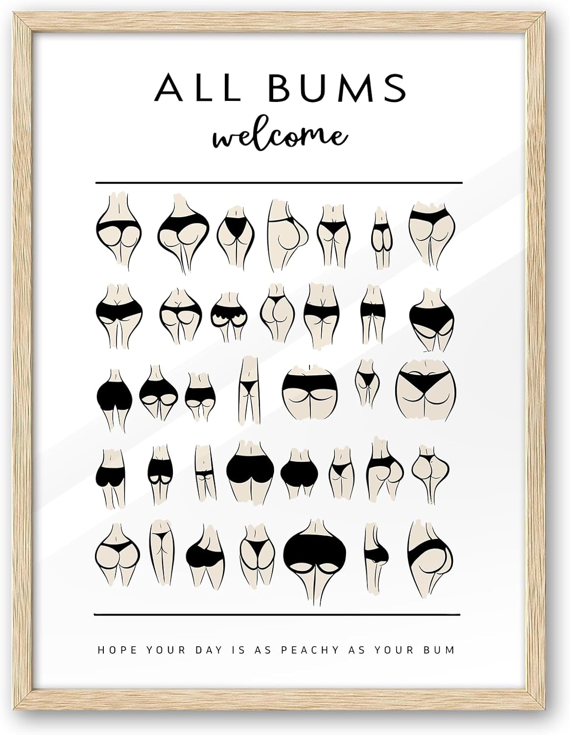 - 12x16in Humorous Bathroom Canvas Art: Featuring the cheeky quote "All Bums Are Welcome" with a fun "Nice Butt" twist, this canvas print adds personality and humor to any restroom space.