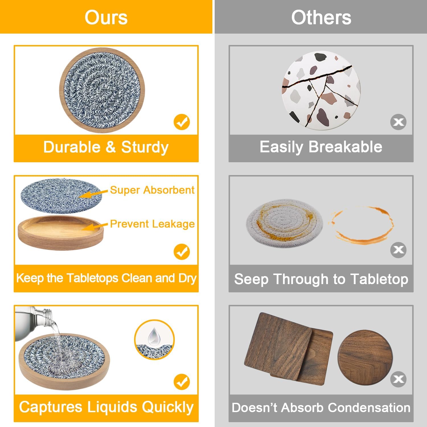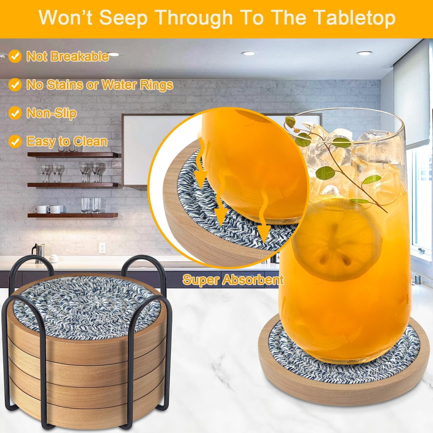 - 【Coasters with Holder】: Super absorbent coaster set comes with a practical metal holder for easy storage; the coasters are woven inserts and wooden base construction that can absorb a larger amount of condensation and ensure moisture does not permeate the table, keeping the table dry to prevent stains or water rings.