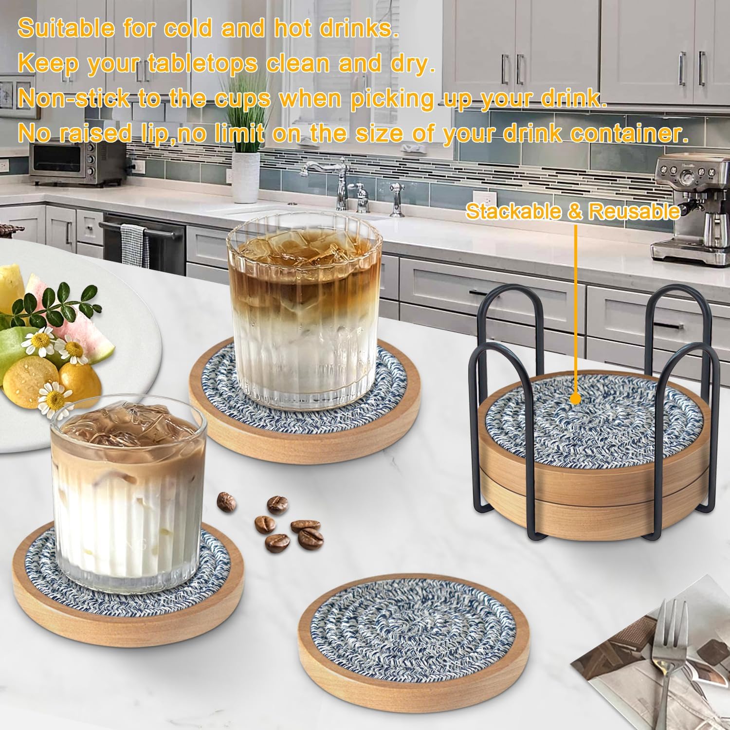 Coasters for Drinks Absorbent Sets of 5, Eykao Woven Coasters with Holder, Housewarming Gift for Farmhouse Home Decor, 4 inches (Mixed Blue)
