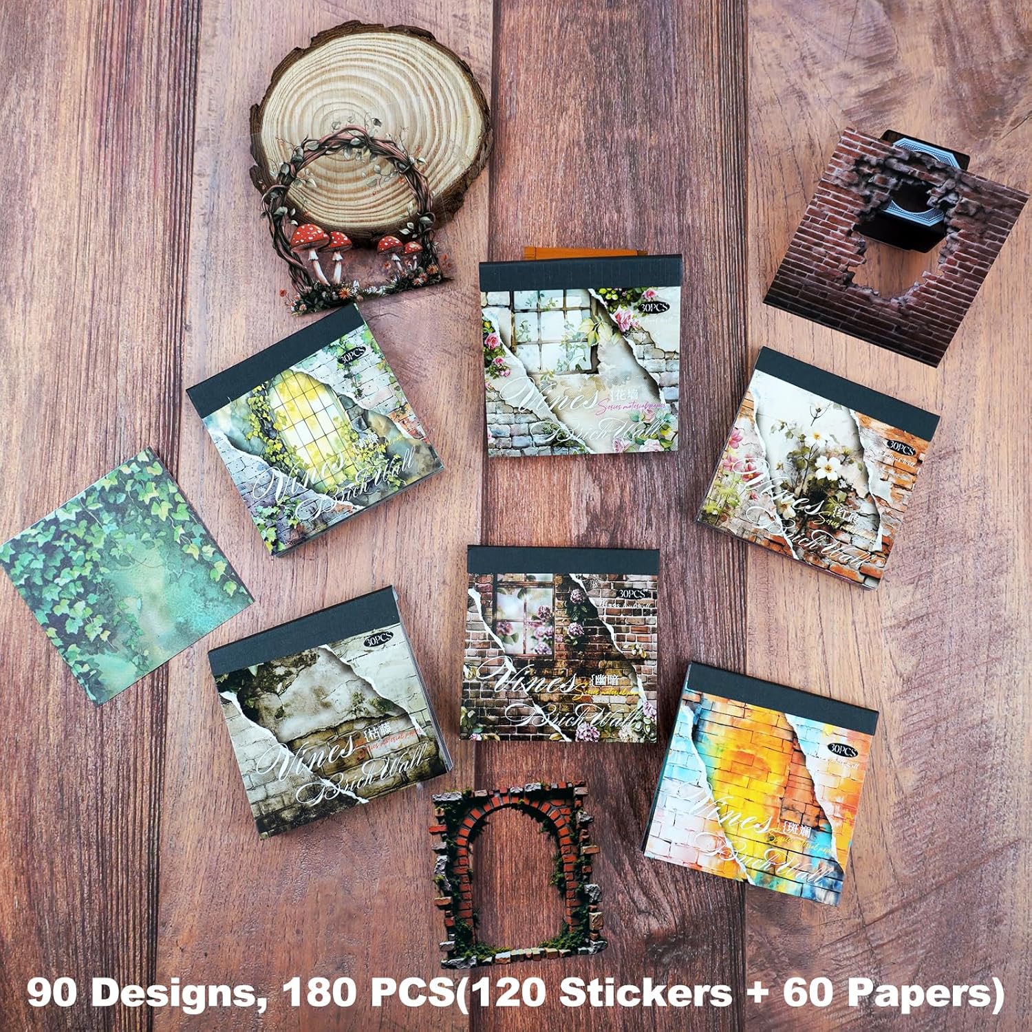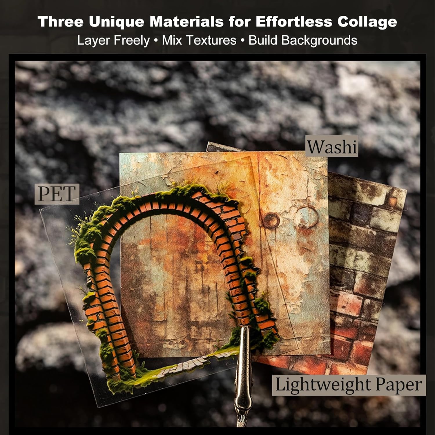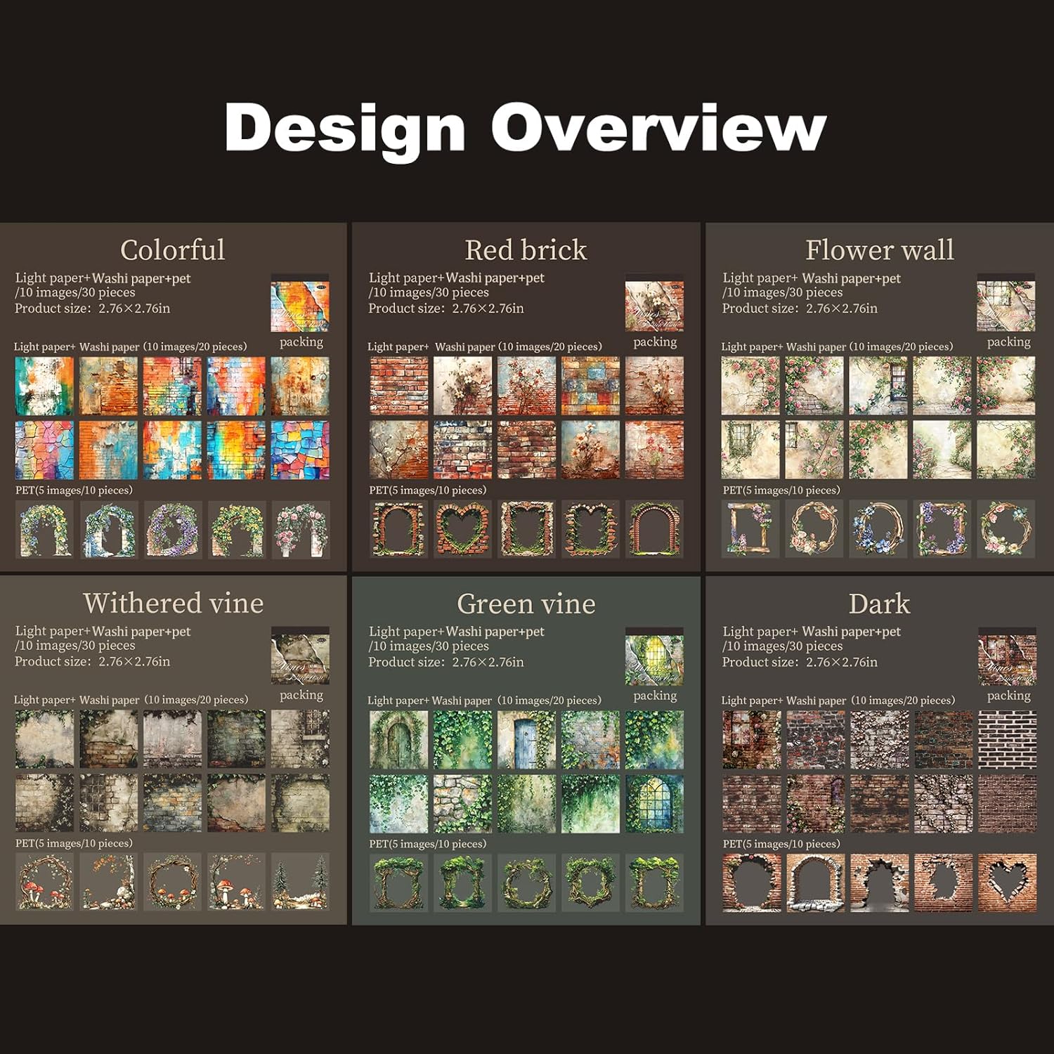 - Vintage-Inspired Visuals: This kit includes 180 pieces—60 PET stickers 60 washi stickers and 60 paper sheets—all featuring brick wall textures vine themes arches and distressed stone details to enrich scrapbooks and junk journals with layered vintage depth